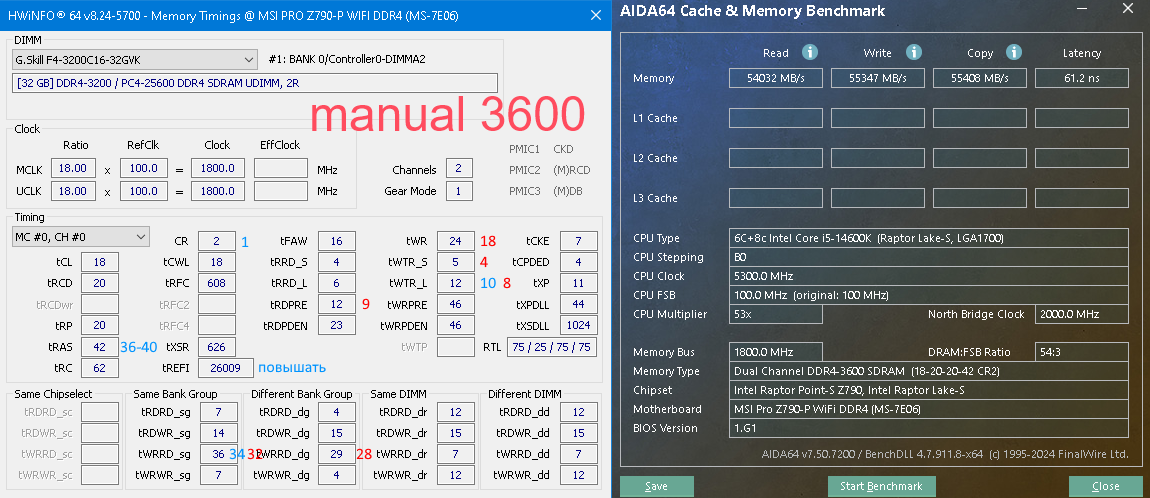 есть система 14600к / MSI Pro z790p с памятью g.skill f4-3200c16d-64gvk - две плашки по 32гб, двухранковые, с чипами Hynix MJR, профиль xmp 3200 16-18-18-38. в интернете пишут, что чипы MJR гонятся плохо или не гонятся вообще, плюс у них чуть ли не самые высокие требования к tRFC, и что от поднятия напряжения они работают только хуже. до кучи в тайфуне чипы показаны как downbin, то есть отбраковка если я правильно понимаю.