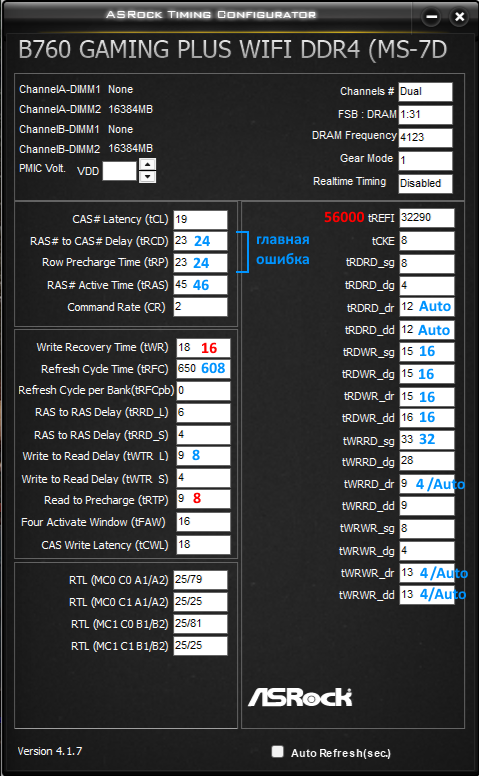 Пытаюсь настроить память Adata XPG spectrix D50 2x16 Gb 4133 MHz (CJR) Сначала с нейросеткой пробовал, напруги крутили, чем дальше с ней пытаешься настраивать, тем больше она куда-то не туда ведёт В итоге под 4133 19-23 по таблице simplenov вбил значения (RD-WR не трогал), погонял, потом tRFC 650 сделал, гонял, далее начал вбивать из "лучше", но уже бсоды и ошибки, пробовал tRFC на 700 с таким значениями поднять, не хочет. Напругу уже не хочу поднимать. Вот и думаю, что-то можно по таймингам подправить? Или лучше пробовать напругу снизить? Или и то, ито? На долгосрок для игр стабильное хочется, но не хочется первички ниже, чем зашиты в XMP.