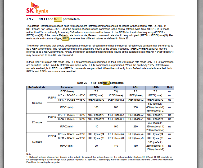 Below are the typical tRFC in ns for the common ICs: IC tRFC (ns) Hynix 8Gb AFR 260 - 280 Hynix 8Gb CJR 260 - 280 Hynix 8Gb DJR 260 - 280 Micron 8Gb Rev. E 280 - 310 Micron 16Gb Rev. B 290 - 310 Samsung 8Gb B-Die 120 - 180 Samsung 8Gb C-Die 300 - 340