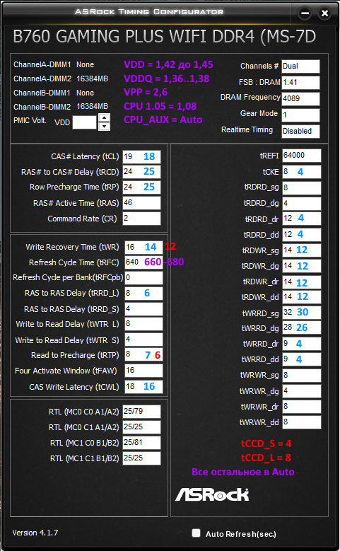 Найди в MSI биос, bandwitch enhanced и AI mode - ставь предмаксимальными. Я бы даже поставил пока tREFI = 32768, стабилизировал бы при 1,42В или немногим выше (при tRFC =660..680), и только потом повышал бы постепенно tREFI. Строковые tRCD tRP очень плохие на CJR (и их лучше стабилизировать повышенным VPP), так что их делай наоборот - больше, не страшно это. Но зато tCL на CJR, часто удается хорошо снизить, пользуйся этим. Тайминг сильно зависит от VDD, имеем ввиду.