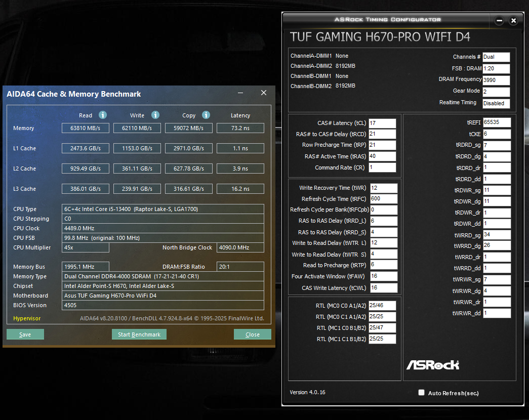 SunRise777 , 1. Гипервизор отключи. В теме уже кто-то писал как это сделать, поищи. 2. У тебя режим Gear 2 (КП работает на половине от реальной частоты памяти, т.е. в твоем случае на 1000 МГц). Если уж перешел на этот режим, там частоты должны быть 4800+, чтобы этот режим был действительно эффективен, а лучше 5000+. 3. Я почему-то раньше не заметил. У тебя non-K процессор, поэтому напряжение SA (System Agent, по сути контроллер памяти) заблокировано, из-за чего поднятие частоты памяти выше 3466-3600 МГц в Gear 1 - становится практически невозможным, с адекватными этим частотам таймингами. Пробуй 3600 и оптимизируй тайминги. Либо надо пытаться в Gear 2 поймать удачу, там большого SA не нужно. Ну, латенси будет повыше, не так уж и срашно. То, что ты получил 4000 в Gear 2 - уже удача, и результат очень хороший для этого режима на этой частоте. Пробуй ужимать тайминги и увеличивать tREFI. Вспомогательные напряжения могут помочь (но не возлагай больших надежд). Думаю, что 4600...4800 МГц в Gear 2 будут вполне доступны (учитывая 1 Rank), тогда ПСП может нивелировать потерю латенси от перехода на Gear 2.