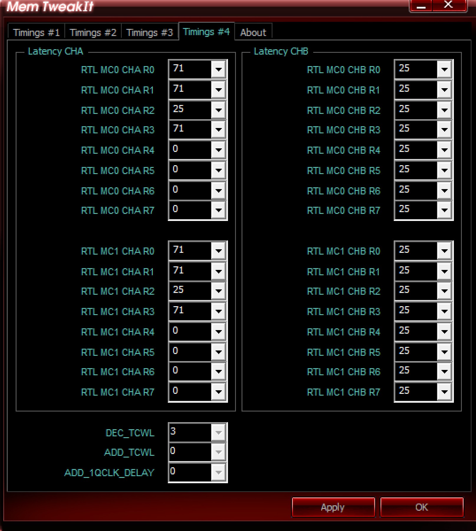 25 для всех рангов это не реально, это баг. Это GB... или проблема с контактами модуля или сокета ЦП. Плохие контакты вносят дополнительную задержку. Проверить прижим ЦП и пробовать поменять модули местами (что покажет?). Конечно, 71 и 25 это очень плохо.