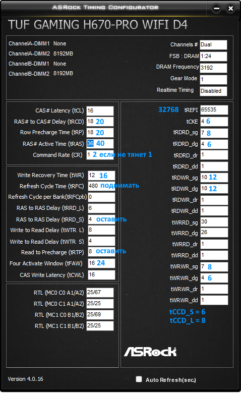 tRASmin=tCL+tRCD+2 WTRS/L устанавливаются в биосе через WRRDdg/sg согласно формуле: WRRD_sg=6+CWL+WTR_L WRRD_dg=6+CWL+WTR_S WR - через WRPRE (для матплат ASUS): WRPRE=4+CWL+WR RTP - через RDPRE (для матплат ASUS) RDPRE=RTP
