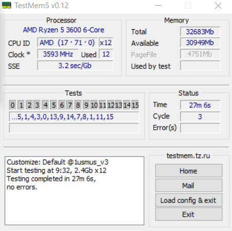 7. При желании протестировать память избыточным тестом в TM5 с конфигом 1usmus_v3 меняем количество 3-х циклов в "mt.cfg", "cycles=3" скажем на 8 или более