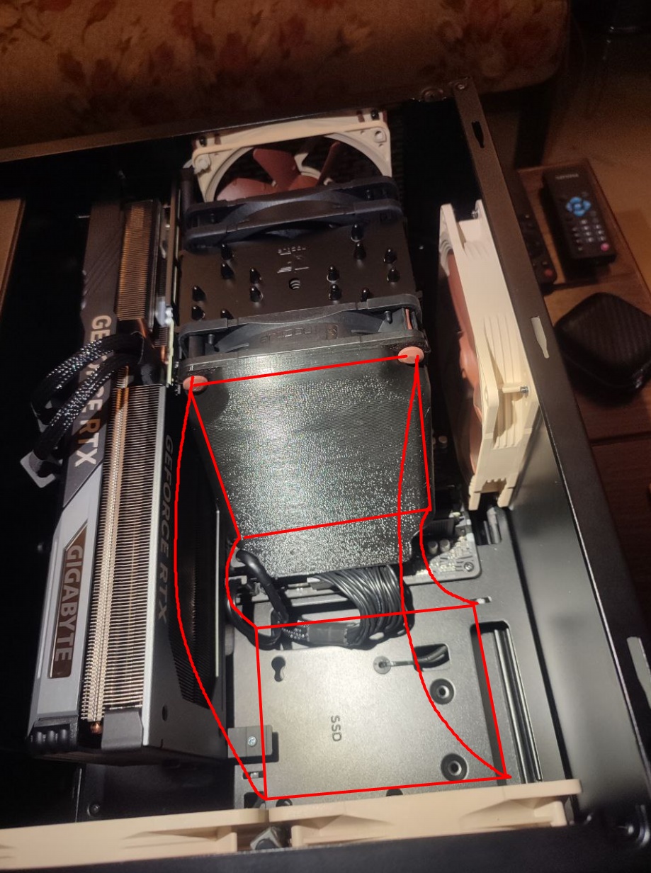 Да, корпус можно поменять, чтобы был боковой вдув. Тогда воздуховод можно сделать длиннее и накрыть им забор воздуха сбоку. Форму можно оставить можно такой же треугольной или сделать более обтекаемой. Тогда и проблем с ростом температуры ЦП не будет и память шикарно охладится.