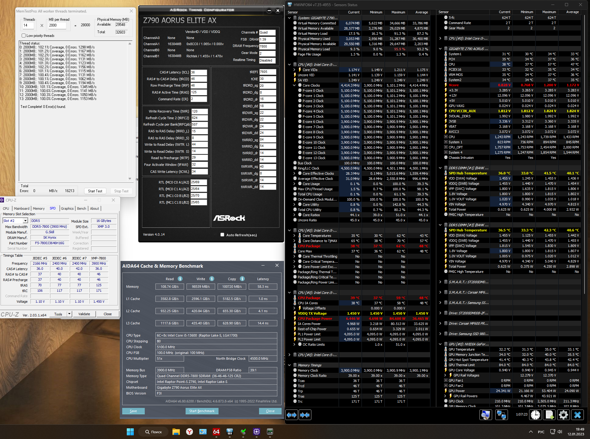Небольшой отчет про киты F5-7800J3646H16GX2-TZ5RS на бюджетной гиге z790 elite ax в связке с 13600kf: XMP 7800 запускается без проблем, даже memtestpro успел на 100% пройти (скрин прилагаю). Но если дать нагрузку на по типу кранчера или occt (тест с нагрузкой КП), то спустя минуту сыпет ошибки. Методом "тыка" пока удалось стабилизировать планки на 7200 с таймингами 36-44-44-62 (при напряжении 1.4). Кстати, hynix m-die могли максимум 6800 на этой плате. Вот теперь сижу и думаю - это косяк бюджетной платы, сырого биоса или контроллера процессора...