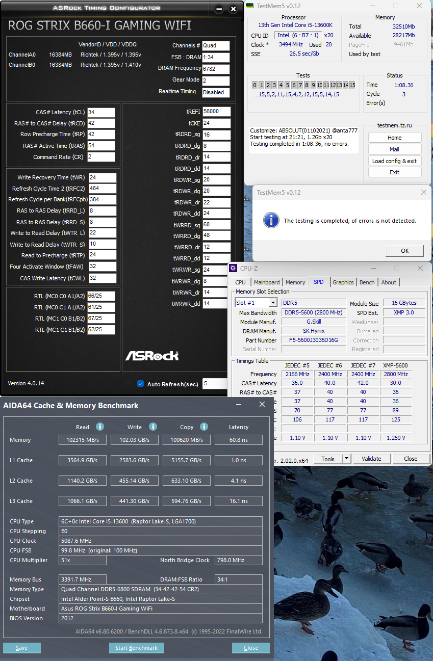 подсмотрел вторички, третички на прошлой странице, был приятно удивлен результатом. Сдал каличную адату, взял Gskill 5600 c30 сегодня в днс. По вольтажам sa 1.12, tx 1.15, imc 1.39 память 1.4/1.4. Правда нагрев без обдува ближе к 80 идет через 15 минут мемтеста. С обдувом 65. Не знаю, как там у некоторых в мемтесте 57 нагрев без обдува.. Результат превзошел ожидания) раньше думал, плата выше чем в 6400 не умеет