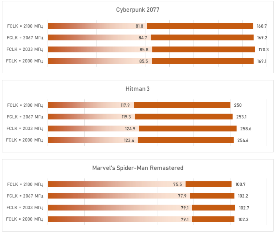 прибавка к номинальной частоте Infinity Fabric дополнительных 100 МГц, что повысит её пропускную способность с 64 до 67 Гбайт/с и вряд ли как-то качественно повлияет на ситуацию. Кроме того, при разгоне этой шины выше 2000 МГц возникают серьёзные сложности с проверкой её стабильной работы. Протокол Infinity Fabric обладает продвинутыми средствами коррекции ошибок, и при их возникновении стабильность теряется далеко не сразу. Вместо этого от прироста частоты возникает обратный эффект — реальная пропускная способность шины не растёт, а падает. Более того, такая ситуация, скорее всего, будет «плавающей»: падение производительности будет возникать не всегда и не во всех приложениях — поэтому отловить её может быть очень непросто.