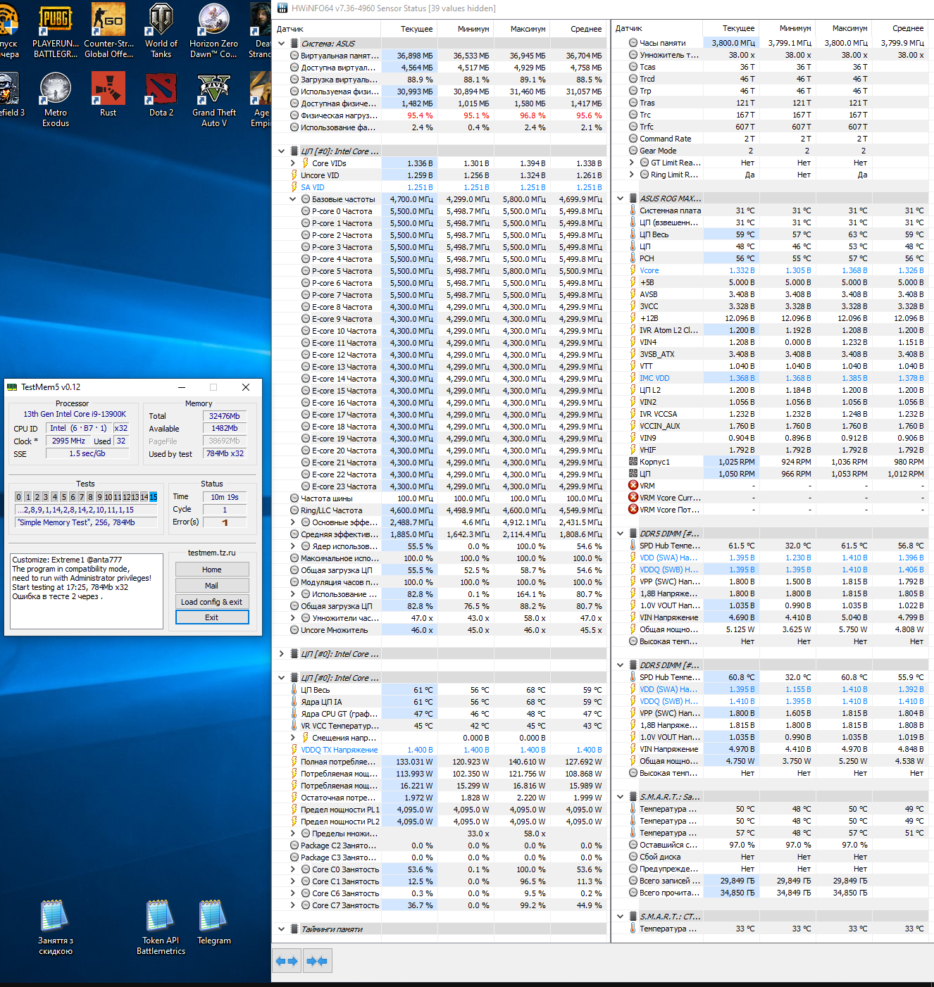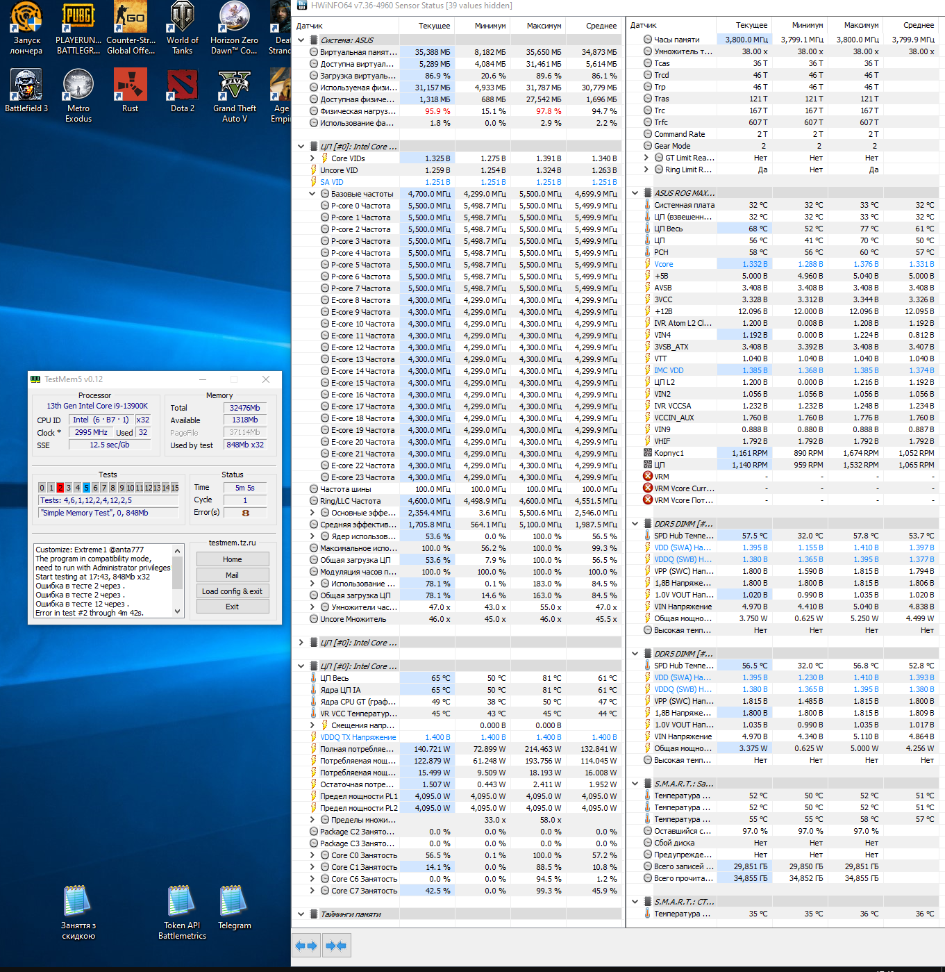 Привет всем, решил плату пока не менять на z690i unify 8266 cl34 пытаюсь стабилизировать. Задержку не смотрите, в фоне виртуалка висит. После 5-10 минут ошибки сыпать начинает, видимо для 690 чипсета это уже много. 7800сл32 стаб пока. #77