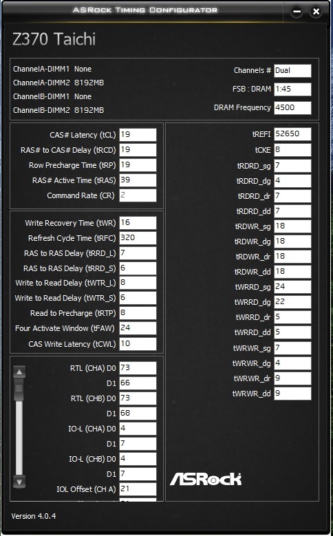 Начните с RCD, CL. Не обязательно должны быть одинаковыми, обычно CL идёт меньше чем RCD. RAS сразу пробуйте как RCD+CL+4, до этого значения от него существенная разница, дальше меньше. CWL<=CL. Допустимые значения 9,10,11,12,14,16,18,20. RP можете выставить по RCD, если пойдёт меньше - тоже неплохо, не уверен правда насчёт смысла. RTP без формул. Если не идёт вниз можно попробовать поднять чуть чуть RP. В DDR4 явно связан с WR соотношением 2 к 1 (например WR20\RTP10), физически хранится одно значения и в зависимости от операции интерпретируется. Скрутите FAW до 16(так и оставьте если работает). С таким FAW скручивайте RRD(оба, L обычно больше чем S), возможно поедут на 4 оба. Если до 4 не удалось спустить поднимите FAW до уровня RRDL*4 и попробуйте ещё, хотя это скорее всего уже почти предел. Обычно L>=S. L - SG(Same Group). S - DG(Different Group) Напр. RRD_L>=RRD_S. CKE=5 СCDL>=4 RDRD_DD и прочие подобные можно проигнорировать если у вас нет двух планок на один канал (4 планки). DD-Different Dimm. Тоже самое с DR-Different Rank если у вас одноранговая память. RDWR_SG(DG) и подобные сочетания скручивайте до минимальных рабочих, потом накиньте сверху +2. Как уже отметил обычно SG>=DG. WTR не трогайте он сам спустится когда будете скидывать WRRD_SG(DG) и прочие подобные. Если сам меньше не стал тогда руками скидывать. WR снижать через WRPRE если есть. Если нет или не снижает WR, То скрутите его скажем до 12 или +4 от рабочего, потом дожмёте если не лень будет. RFC явных формул нет, крутить после всего списка сверху. Не пытайтесь найти его минимальное значение если не хотите чтобы память начинала сыпать ошибками от любого чиха. найдите пограничное со стабильностью значение и накиньте сверху 20 или сразу 40. Может реагировать на RAS+RP, RRD, FAW, причём в обе стороны (то есть может "сломаться" если задрать названные), а может и не реагировать... REFi больше лучше. Связан с RFC. REFI сколько память "работает" - RFC сколько "отдыхает". Оба тайминга лучше не пытаться найти предельное значение.Заметно реагируют на температуру. Многие тайминги отзываются и на температуру и на напряжение. Поскольку напряжение может как позволить снизить тайминг, так и увеличить температуру, то середину можно искать очень долго, поэтому лучше бы вовремя остановится. Тестируйте тщательно с перезагрузками, сном, холодным стартом. RTL и IOL вам кто-то другой пусть советует как настраивать, от них у меня голова болеть начинает...