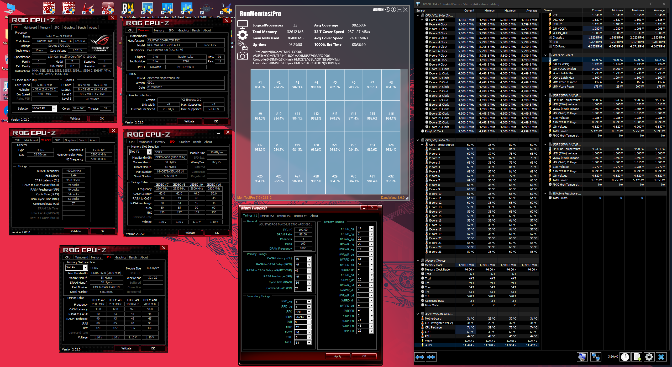 Обрёл тут интересные плашки на M-die, перспективные, но с лоченым контроллером. В 1T на 6933 проходят экстрим с теми же таймингами на Z690 Dark (SA=1.2, TX=1.21, VDD 1.435, VDDQ 1.425) На моём Apex Z690 эти сволочи стабильном могут 6600CR2, всё что выше - так или иначе с ошибками. В чём может быть беда (кроме неработающего анлока GMT контроллера - Асус её поломал видимо, т.к. про это у них уже спрашивали на оф.форуме - будет хз когда). Тайминги такие: tRTP=14 всё равно не выручает, tWTR S перебирал от 8 до 14 - везде ошибки. SA=auto (перебирать пробовал - ловлю нестарты) TX=1.305 (или Auto для 6600), VDD 1.42, VDDQ 1.415 - тоже чутка покрутил, но эффекта не добился. Что остаётся - только перебирать напряжения с прецизионной точностью?