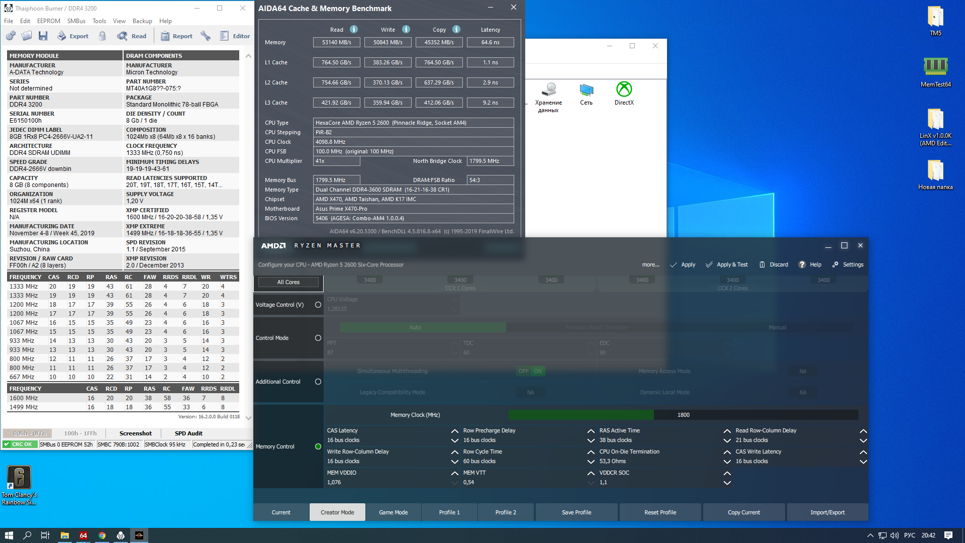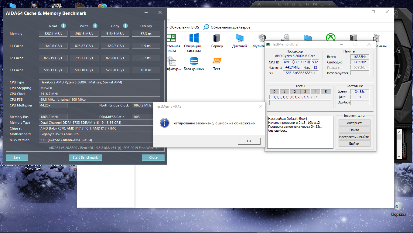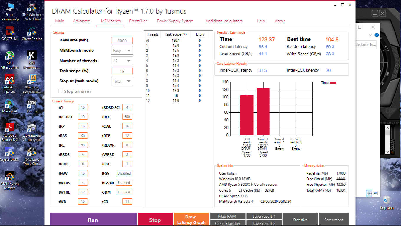 материнка GIGABYTE X570 AORUS PRO, память BLS8G4D30AESCK две планки по 8GB cl15 3000 .,проц RYZEN 5 3600X ., мой максимум 3733, но видя ваши результаты я не нахожу ответа КАК?)