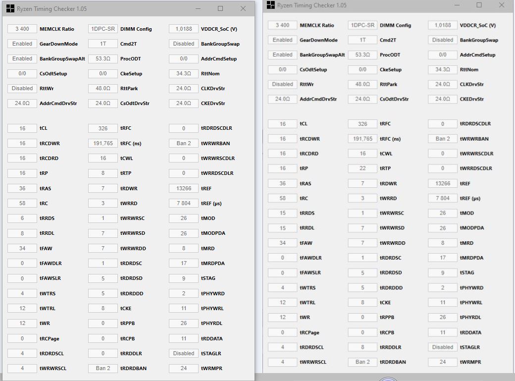На сок не пробовал. 1.05в при 3466 выставлено\подобрано для 4х8Гб, копирование l3 в норме. Напряж на память добавлял и заводилось. Да дело не в этом, работать то работает все. С калькулятора 6:3, 7:3, 8:3. Просто хочу разобраться, как правильно. Может правильно 4:2, 6:3, 8:4, 10:5(не просто же так пишут, что парами их надо настраивать и в биос пределы для tRDWR / tWRRD 31/15), а может и пофиг, главное что бы работало. Да и само оно(на авто) 10:1, 7:3, 8:3 ставит в зависимости от частоты(имхо, от сопротивлений, таймингов некоторых остальных). Только почему если, получается, ослабляешь тайминг, то больше напряжения просит, не понимаю Из шапки "RDWR_SG(DG) и подобные сочетания скручивайте до минимальных рабочих, потом накиньте сверху +2." rdwr скручивается, это ладно. А wrrd куда скручивать, если он 1 установлен в авто? Добавлять если, то хуже становится. Те 7:1 можно оставлять? И получается при 7:1 производительность выше должна быть, чем при 7:3? То что там наносек и не видно этого, это понятно, сам факт интересует, так или не так. =============== Судя по бенчу из калькулятора, то 7:1 быстрее 7:3. И соответственно чуть больше напряж требует. Почему у меня 7:3 не стартовало, похоже богу амд только известно. Теперь нормально все работает. Да и в целом разобрался, вроде, с tRDWR / tWRRD.