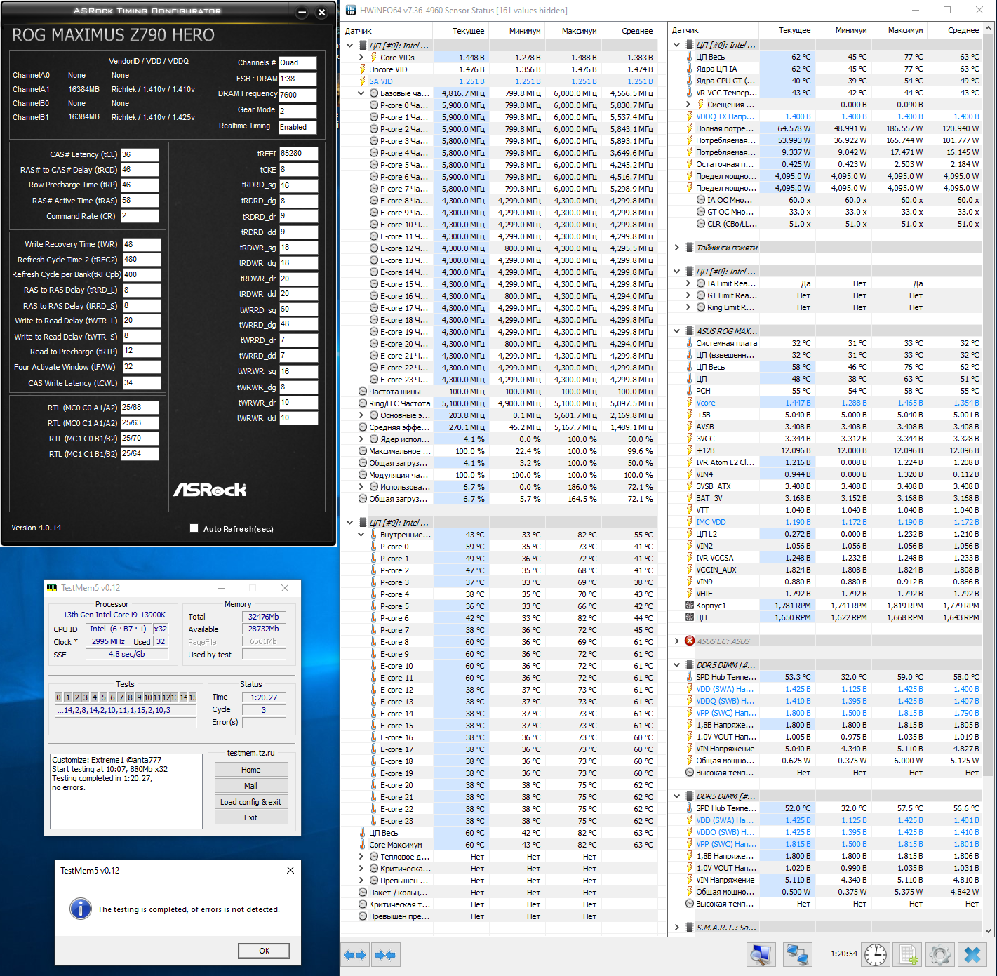 Далее. A-Data DNS 2*16 RGB - это A-Die, но ооооочень плохой A-Die. Работает ТОЛЬКО НА Z790 APEX правильно. Ни EVGA Z690, ни MSI Z690/790, ни Gigabyte Z690 не работает с ними выше 6000 МГц! Запускается хоть 8000. Но даже на 7200 только включаешь тест, да даже на 6800, 1-2 сек и комп зависает, затем вырубается. Потом включается и так по кругу. Подбор сопротивлений помогает, но не держится дольше 10-15 сек в serj. В общем MSI Z690 Unify-X у Олега на 7200 сыпало сразу, моментом, на Z790 Apex 8000CL36 - всё хорошо.
