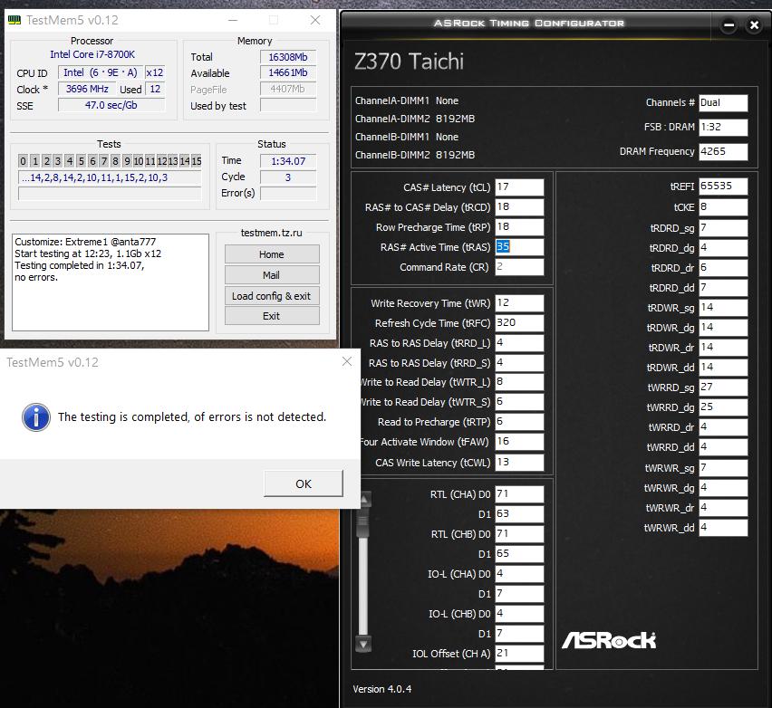 В общем мать явно тайминги какие-то косячит, на 3400 16-19-19-38-2T при том же напряжении в 1.36 аналогичная редкая ошибка в 4 тесте, как и на 3300 16-18-18-38-2T. "Лёгкий" тест её видимо год назад не выявлял, так что пока откатился на 3200 Мгц, так как 3266 у меня нет. Понизил напряжение до 1.32, прогнал 9 циклов тестмема, без ошибок. Заодно температуру померил пирометром, при +24 в комнате в конце теста (~20 минут спустя) максимально было +47.5 градуса. Во время стресс-теста аиды не больше +44. Вот думаю, много это или мало для оем планок, может, радиаторы с али заказать?..