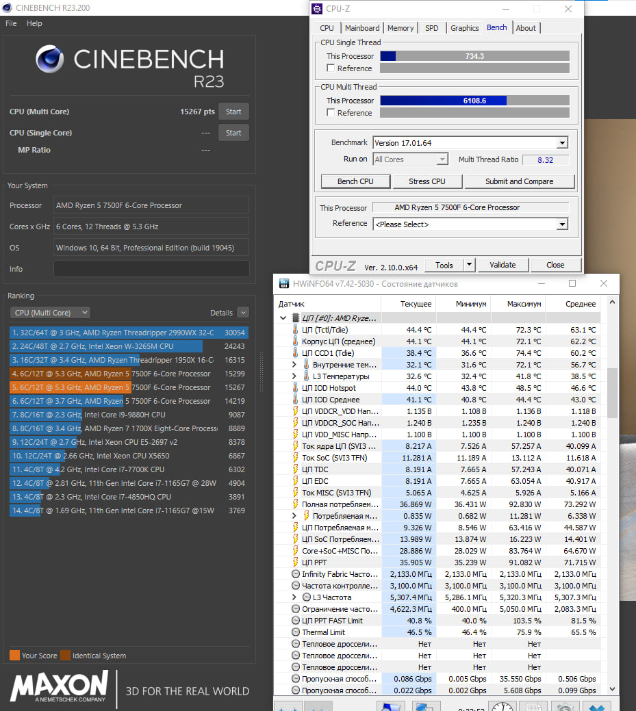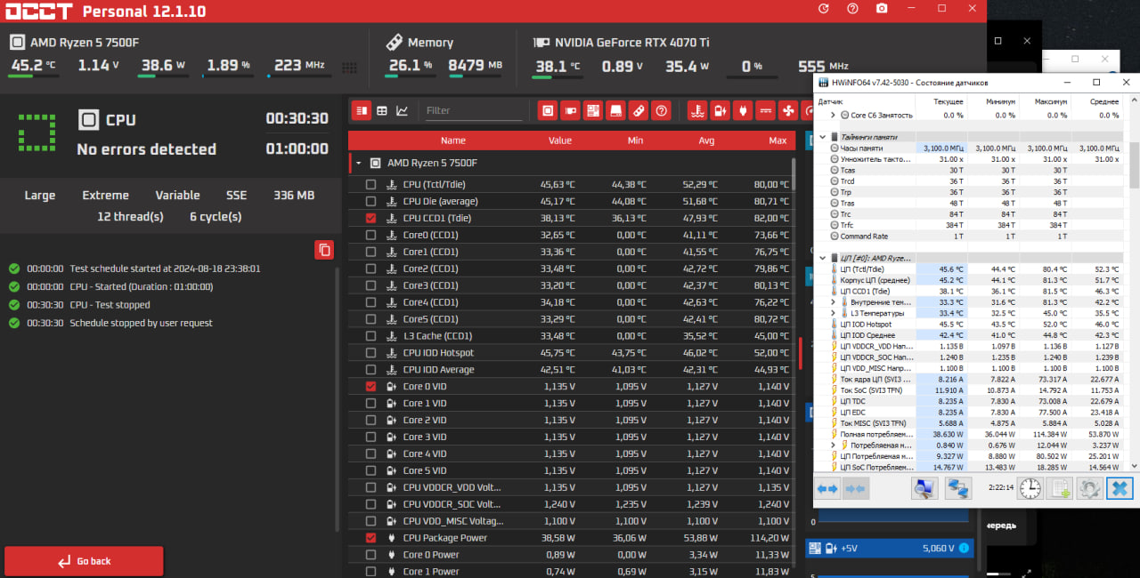 Прошу оценить мой силикон 7500f и разгон в целом. Взял 5300 при вольтаже 1.14, 1.13 проходит r23, но вылет в occt. 1.14 полет абсолютно стабильный во всем уже третий день тестов, кроме prime95, там моментальный краш даже при 1.20 - бред какой то, думаю дело в памяти, но отдельно она проходит тм5 прессет 1usmus. Не думаю что я в какой либо реальной задаче встречу нестабильность. По итогам - прирост 1000 попугаев в r23 относительно стока (общее 15267), полностью сравнялся 7600Х. Однопоток тоже радует и набирает 734 в CPUZ, равняясь плюс минус со старшими ам5 процами. А самое главное - температуры полностью идентичные стоковым на моей воде mystique 360, градус в градус что сток, что стресс. Хоть и вырос теплопакет до 110в но теплообмен воды видимо это не замечает. Пробовал выше, но сильно масштабируется вольтаж, 5500 при 1.26 иногда дает краш в cinebench, дальше в эту сторону идти посчитал бессмысленным, безумно невыгодно растут температуры даже в стоке, выдавая всего 15500 попугаев в r23. Крайне невыгодная сделка. Решил остановиться на достигнутом, результат считаю крайне удачным. У меня крутой кремний, или я ошибаюсь? В сети мало информации по разгону в фиксе. И последнее, сравнивая полный сток биос с разгоном cpu и рам, результат в 720p в superposition получается 46447 и 54240 баллов. Чистый прирост 17% производительности.