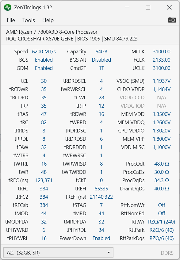 У вас как раз не очень все настроенно. 35, 47 вот эти цифры к чему при включенном GDM? Он все округляет в большую сторону. RFC не настроен, некоторые вторички, хоть и не нужные, без внимания. Говорите о повышенных напряжениях, зачем вам vddio 1.3 при vddq 1.26? Оно не должно превышать vddq, и в вашем случае 1.25 едва ли нужен. К слову, вдруг вы не вкурсе - VDD VDDQ это напряжения которые условно "напрягают" только планки, а vsoc и vddio - ЦП, и если условно бесконечно повышать VDD/VDDQ то сгорят планки, а если vsoc/vddio - ЦП. В общем видится противоречие у вас на этом месте - на планки с гулькин нос, при этом vddio накручен под более высокие значения vdd/vddq, и просто так подогревает. Про FLCK не буду ничего говорить, оно конечно дает в любом случае, но так как профит по сути в красивых цифрах - я за синхрон.