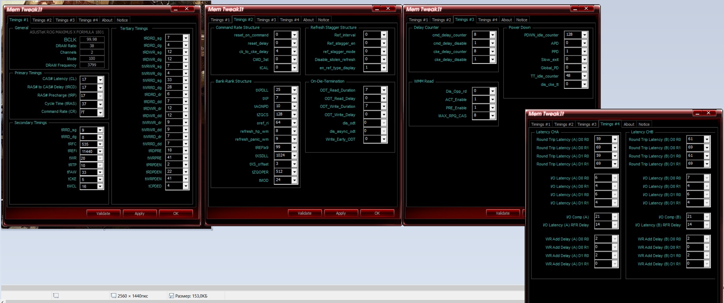 Начните с RCD, CL. Не обязательно должны быть одинаковыми, обычно CL идёт меньше чем RCD. RAS сразу пробуйте как RCD+CL+4, до этого значения от него существенная разница, дальше меньше. CWL<=CL. Допустимые значения 9,10,11,12,14,16,18,20. RP можете выставить по RCD, если пойдёт меньше - тоже неплохо, не уверен правда насчёт смысла. RTP без формул. Если не идёт вниз можно попробовать поднять чуть чуть RP. В DDR4 явно связан с WR соотношением 2 к 1 (например WR20\RTP10), физически хранится одно значения и в зависимости от операции интерпретируется. Скрутите FAW до 16(так и оставьте если работает). С таким FAW скручивайте RRD(оба, L обычно больше чем S), возможно поедут на 4 оба. Если до 4 не удалось спустить поднимите FAW до уровня RRDL*4 и попробуйте ещё, хотя это скорее всего уже почти предел. Обычно L>=S. L - SG(Same Group). S - DG(Different Group) Напр. RRD_L>=RRD_S. CKE=5 СCDL>=4 RDRD_DD и прочие подобные можно проигнорировать если у вас нет двух планок на один канал (4 планки). DD-Different Dimm. Тоже самое с DR-Different Rank если у вас одноранговая память. RDWR_SG(DG) и подобные сочетания скручивайте до минимальных рабочих, потом накиньте сверху +2. Как уже отметил обычно SG>=DG. WTR не трогайте он сам спустится когда будете скидывать WRRD_SG(DG) и прочие подобные. Если сам меньше не стал тогда руками скидывать. WR снижать через WRPRE если есть. Если нет или не снижает WR, То скрутите его скажем до 12 или +4 от рабочего, потом дожмёте если не лень будет. RFC явных формул нет, крутить после всего списка сверху. Не пытайтесь найти его минимальное значение если не хотите чтобы память начинала сыпать ошибками от любого чиха. найдите пограничное со стабильностью значение и накиньте сверху 20 или сразу 40. Может реагировать на RAS+RP, RRD, FAW, причём в обе стороны (то есть может "сломаться" если задрать названные), а может и не реагировать... REFi больше лучше. Связан с RFC. REFI сколько память "работает" - RFC сколько "отдыхает". Оба тайминга лучше не пытаться найти предельное значение.Заметно реагируют на температуру. Многие тайминги отзываются и на температуру и на напряжение. Поскольку напряжение может как позволить снизить тайминг, так и увеличить температуру, то середину можно искать очень долго, поэтому лучше бы вовремя остановится. Тестируйте тщательно с перезагрузками, сном, холодным стартом. RTL и IOL вам кто-то другой пусть советует как настраивать, от них у меня голова болеть начинает...