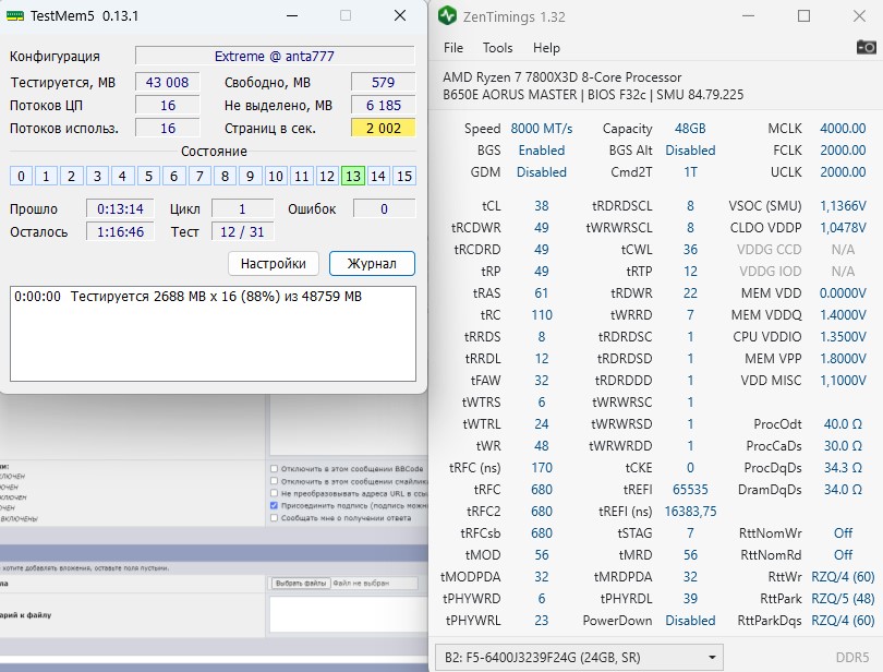 Добрый вечер. Я очередной недотепа, без опыта и большим страхом в глазах. История такая! в 2022 Году были куплены новые железки, в том числе память с XMP профилем для AMD системы, на тот момент я не в курсе был, что они могут не дружить. Kingston FURY Beast Black [KF556C36BBEK2-32] Hynix Die-M Ryzen 5 7600 Gigabyte b650M Gaming AX X Решил все-таки покрутить память, получилось следующее (СМ 2 скриншота) Переживаю только, что температура большая.