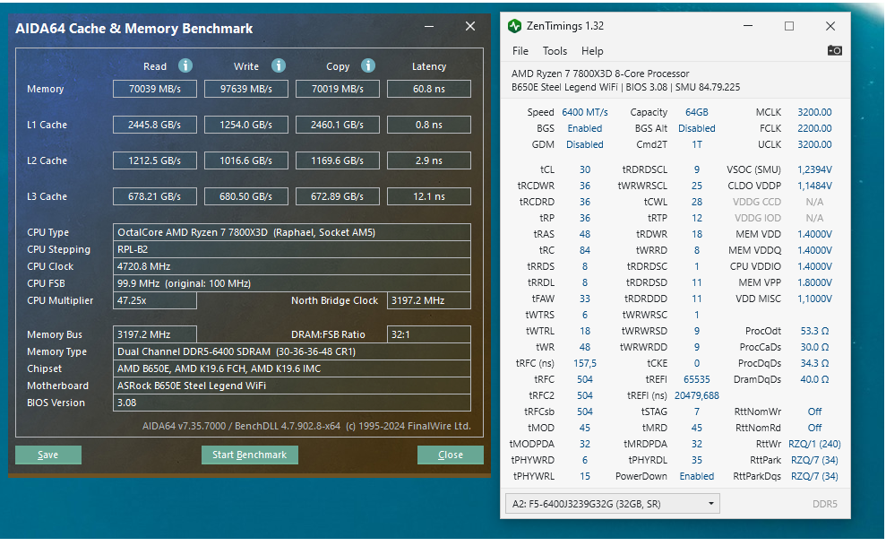 All Какие-то странности происходят с памятью Team Group T-Create Expert 2x24GB (CTCED548G7200HC34ADC01) на плате ASRock X670E Steel Legend: то стабильно с приложенными на скриншоте настройками, то либо валится система, либо ошибки с начала теста TestMem. Причём, снижение частоты до 5600 МГц и ослабление таймингов не помогает, а потом перезагружаешься и снова всё стабильно. Такое впечатление, что либо с тренировками памяти что-то некорректно плата делает, либо какая-то плавающая ошибка в настройках закралась.