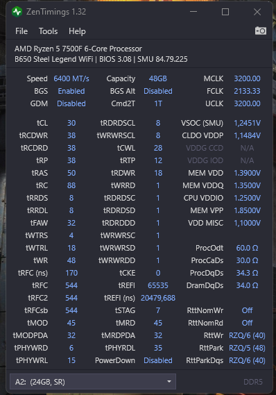 Всем привет! Помогите оптимизировать тайминги, память Kingbank A-die, на 7700x работала на 6000CL30 без проблем, сейчас стоит на хитрой ITX материнке, где впаян проц 7840hs, в биосе частоту памяти выше 4800 нельзя выставить, нет регулировки напряжений, но можно крутить тайминги. Подбирать каждый тайминг очень долго, перекрутил - сброс биоса - настройка заново, перенос таймингов с частоты 6000 на 4800 с пропорциональным снижением не работает, т.к. напряжение на памяти 1.1В всего. Пока выставил 30-36-36, но вторичные тайминги не очень понимаю как выставить, все гайды предполагают разгон памяти...
