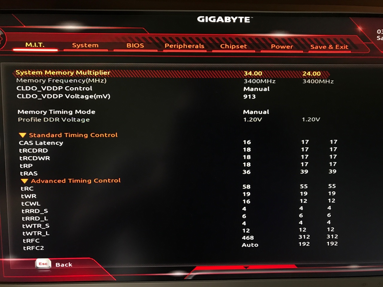 У меня есть подозрение, что на материнках гигабайт проблемы с разгоном памяти. С таймингами из райзен калькулятора система ни разу не стартанула, пробовал все частоты, пришлось подбирать опытным путем. Если смотреть на отзывы, то моя память Kingston HyperX Predator HX436C17PB3K2/16 (b-die, 1 rank), на мси/асусе/асроке гонится гораздо лучше. Остановился на 3400, тм5 проходит без ошибок, в играх вылетов нет. На 3466 тм5 проходит без ошибок только если сильно поднимать вторичные таймиги, например trfc 500+, но игры вылетают через ~30 минут.