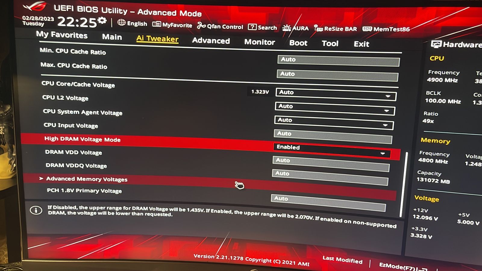 Привет, тут такая конфигурация мать ASUS ROG STRIX B660-F GAMING WIFI + i9 12900kf + память солянка из 2 комплектов G.SKILL TRIDENT Z5 64GB (2x32GB) DDR5-5600 (F5-5600J3036D32GX2-TZ5RK) и H64Gb DDR5 5200MHz Kingston Fury Beast RGB (KF552C40BBAK2-64) (2x32Gb KIT) Память смогла запуститься только на частоте 5000 и то нестабильно - атомик хат вылетает. Не могу в биосе почему то изменить напряжение оперативки - оно стоит авто. Может кто подскажет как на этой материнке напругу поднять можно на памяти