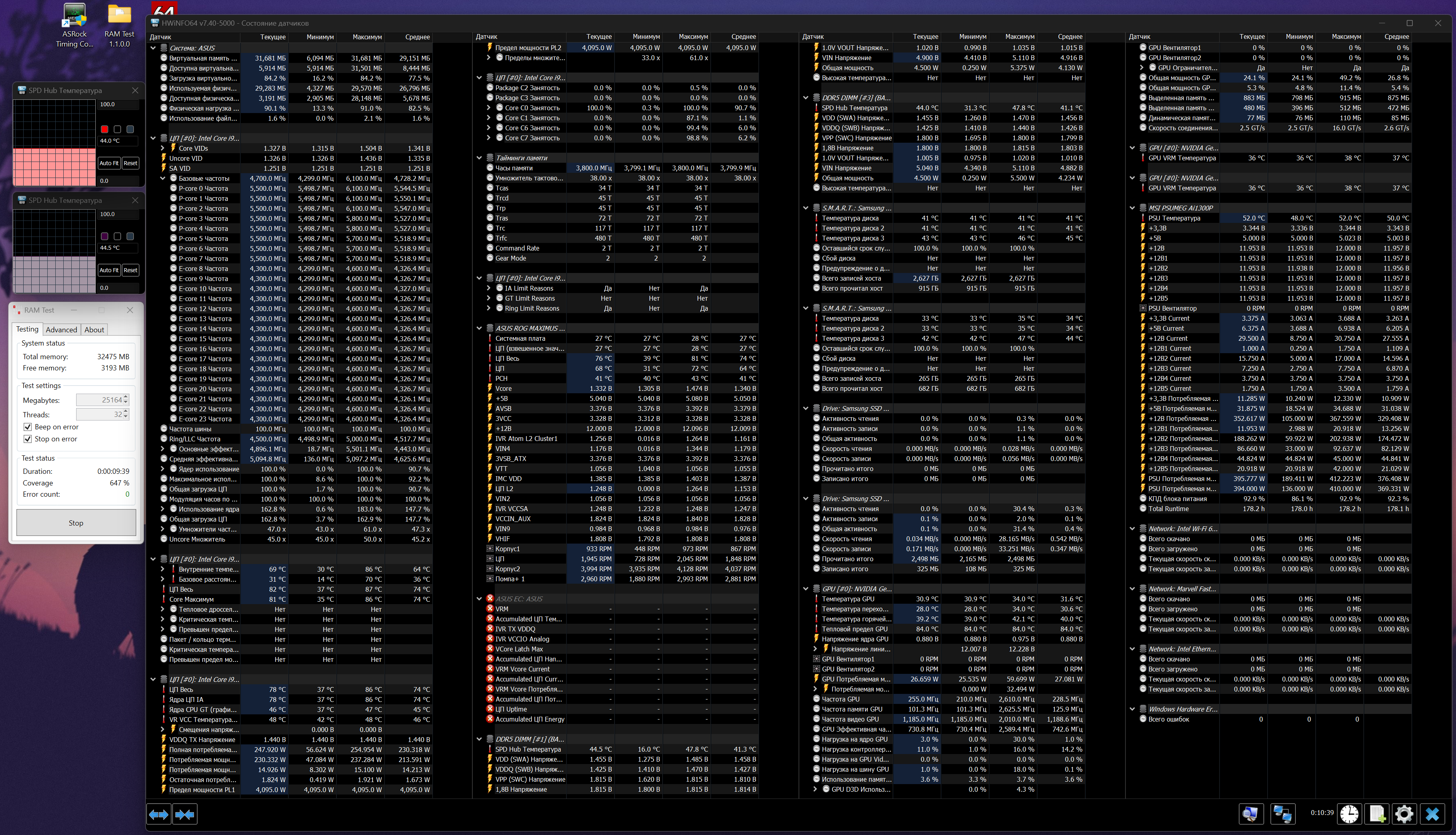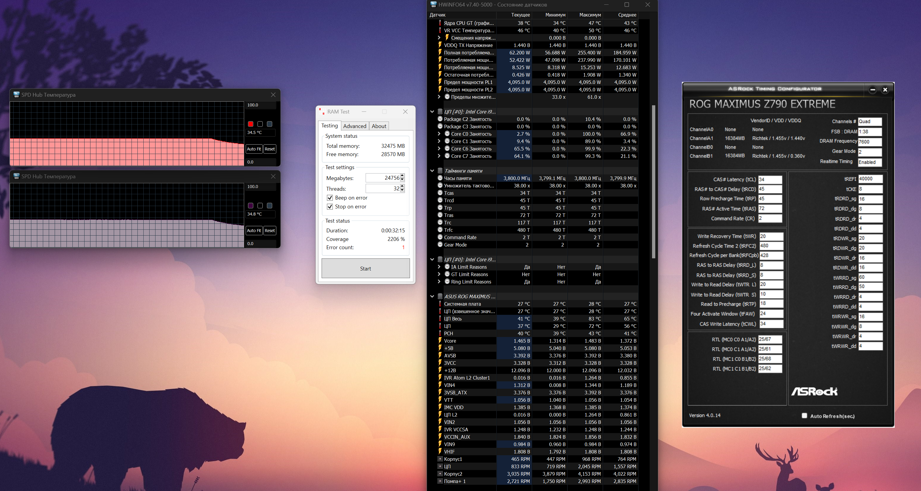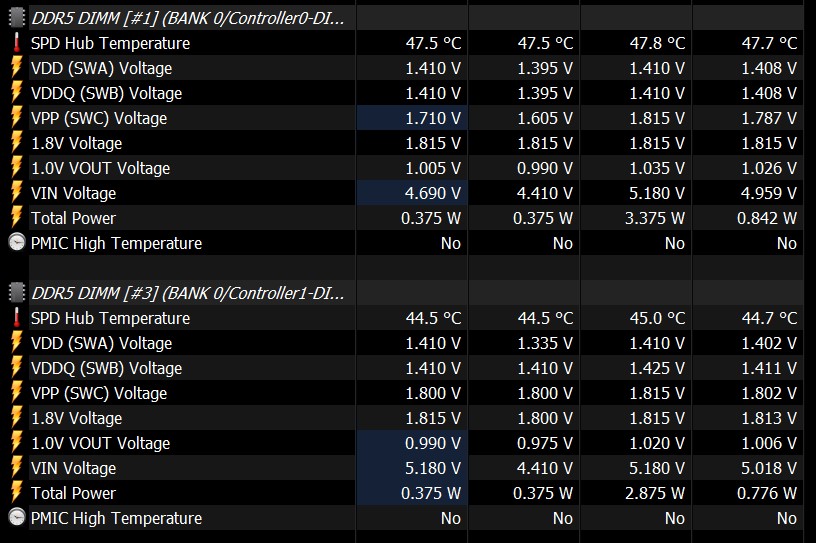 Помогите ребят, память gskill 7800 36-46-46-125 и плата asus rog maximus z790 extreme, поставил на память воздух для охлаждения, и начал пробовать 7600 на 34 таймингах, но тест Ram Test доходит до 1500-2000% и винда намертво зависает и пк перезагружается. С чем поработать? Мне кажется это напряги где то либо мало, либо много VDD/VDDQ= 1.43/1.43 SA= 1.25 IVR TX= 1.44 MC= 1.4 (в HWINFO при тесте показывает 1.368, без теста 1.385) Версия биоса: 0816 (последняя) Температура доходит максимум до 44 градусов (охлаждение на оперативке) Проц: i9 13900k