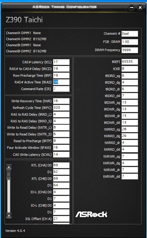 Начните с RCD, CL. Не обязательно должны быть одинаковыми, обычно CL идёт меньше чем RCD. RAS сразу пробуйте как RCD+CL+4, до этого значения от него существенная разница, дальше меньше. CWL<=CL. Допустимые значения 9,10,11,12,14,16,18,20. RP можете выставить по RCD, если пойдёт меньше - тоже неплохо, не уверен правда насчёт смысла. RTP без формул. Если не идёт вниз можно попробовать поднять чуть чуть RP. В DDR4 явно связан с WR соотношением 2 к 1 (например WR20\RTP10), физически хранится одно значения и в зависимости от операции интерпретируется. Скрутите FAW до 16(так и оставьте если работает). С таким FAW скручивайте RRD(оба, L обычно больше чем S), возможно поедут на 4 оба. Если до 4 не удалось спустить поднимите FAW до уровня RRDL*4 и попробуйте ещё, хотя это скорее всего уже почти предел. Обычно L>=S. L - SG(Same Group). S - DG(Different Group) Напр. RRD_L>=RRD_S. CKE=5 СCDL>=4 RDRD_DD и прочие подобные можно проигнорировать если у вас нет двух планок на один канал (4 планки). DD-Different Dimm. Тоже самое с DR-Different Rank если у вас одноранговая память. RDWR_SG(DG) и подобные сочетания скручивайте до минимальных рабочих, потом накиньте сверху +2. Как уже отметил обычно SG>=DG. WTR не трогайте он сам спустится когда будете скидывать WRRD_SG(DG) и прочие подобные. Если сам меньше не стал тогда руками скидывать. WR снижать через WRPRE если есть. Если нет или не снижает WR, То скрутите его скажем до 12 или +4 от рабочего, потом дожмёте если не лень будет. RFC явных формул нет, крутить после всего списка сверху. Не пытайтесь найти его минимальное значение если не хотите чтобы память начинала сыпать ошибками от любого чиха. найдите пограничное со стабильностью значение и накиньте сверху 20 или сразу 40. Может реагировать на RAS+RP, RRD, FAW, причём в обе стороны (то есть может "сломаться" если задрать названные), а может и не реагировать... REFi больше лучше. Связан с RFC. REFI сколько память "работает" - RFC сколько "отдыхает". Оба тайминга лучше не пытаться найти предельное значение.Заметно реагируют на температуру. Многие тайминги отзываются и на температуру и на напряжение. Поскольку напряжение может как позволить снизить тайминг, так и увеличить температуру, то середину можно искать очень долго, поэтому лучше бы вовремя остановится. Тестируйте тщательно с перезагрузками, сном, холодным стартом. RTL и IOL вам кто-то другой пусть советует как настраивать, от них у меня голова болеть начинает...