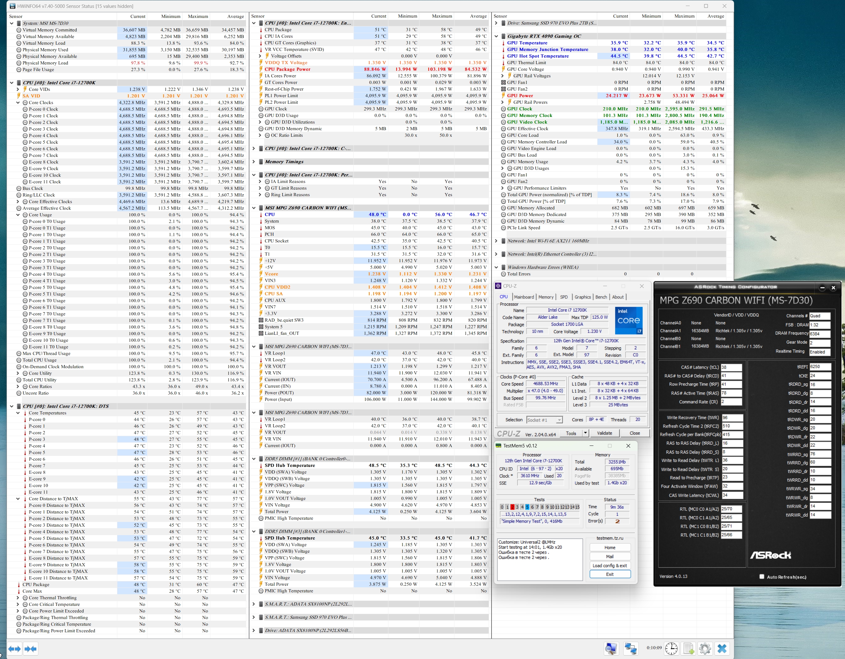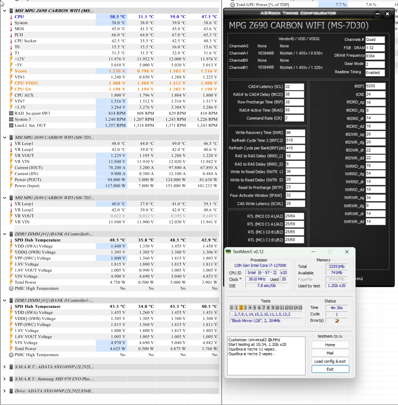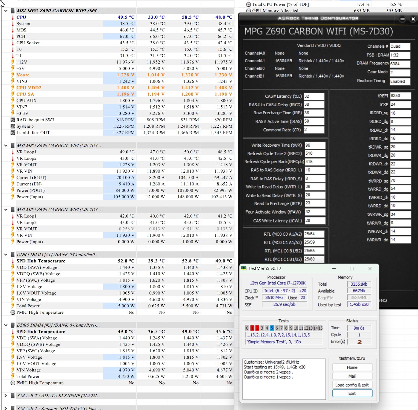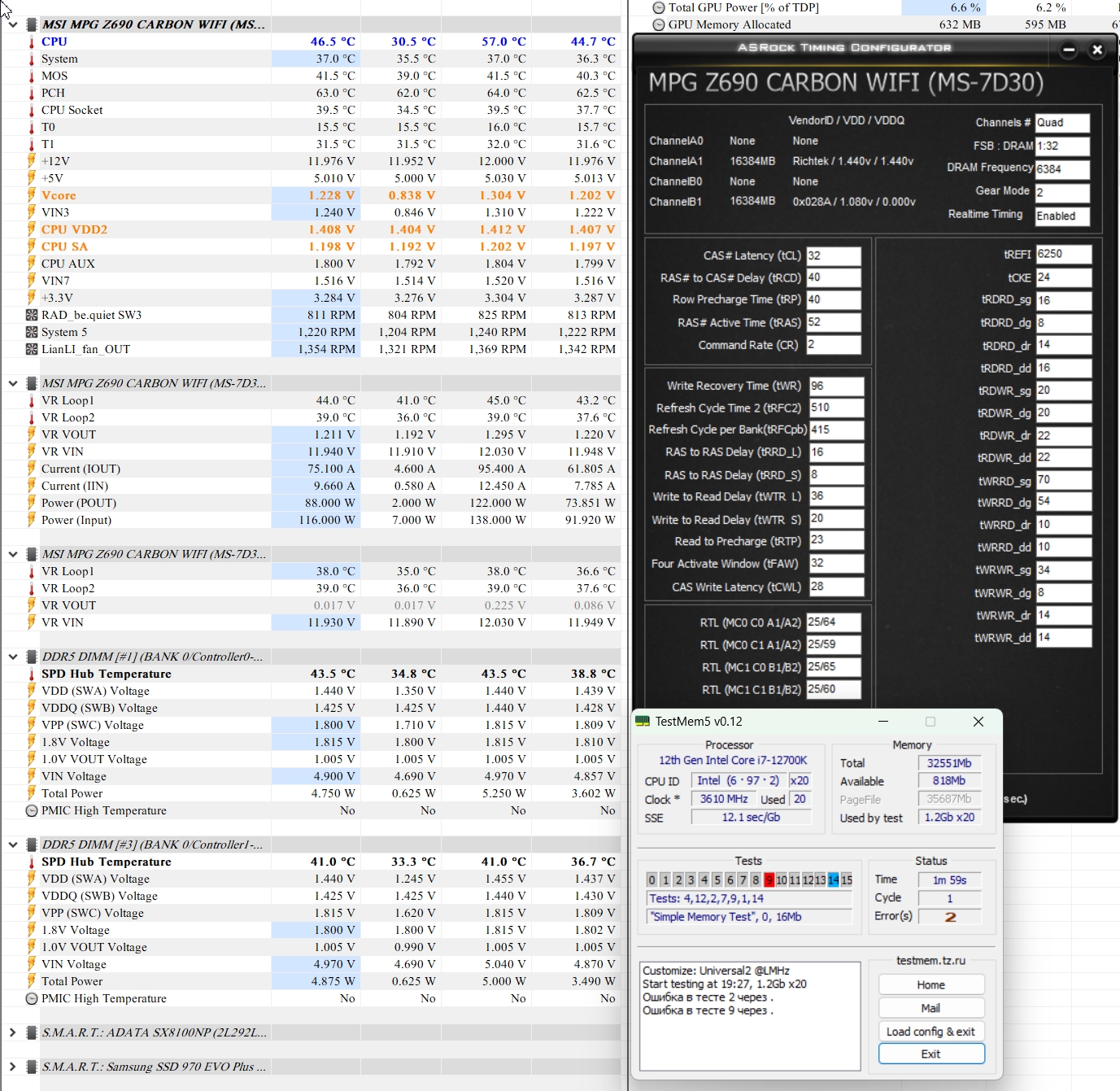 James_on У вас по всей видимости контроллер памяти не тянет выше 6100мгц, раз на других частотах сразу ошибки. Все настройки BIOS, сбросьте до стандартных (Load Setup defaults). После сброса: На вашей материнке есть опция "memory try it", выберите 6400mhz 40-40-40, вольтажи mem Vdd/Vddq поставятся автоматом из выбраного профиля, вы их откорректируйте на mem Vdd 1.45 / mem Vddq 1.43, остальные вольтажи Auto. Запускайте тест, если есть ошибки, значит контроллер памяти в процессоре или материнка не тянет такую частоту. У меня на 12600k+z690 torpedo 6200мгц максимум (стабильно хоть сутками TM5 гоняй).