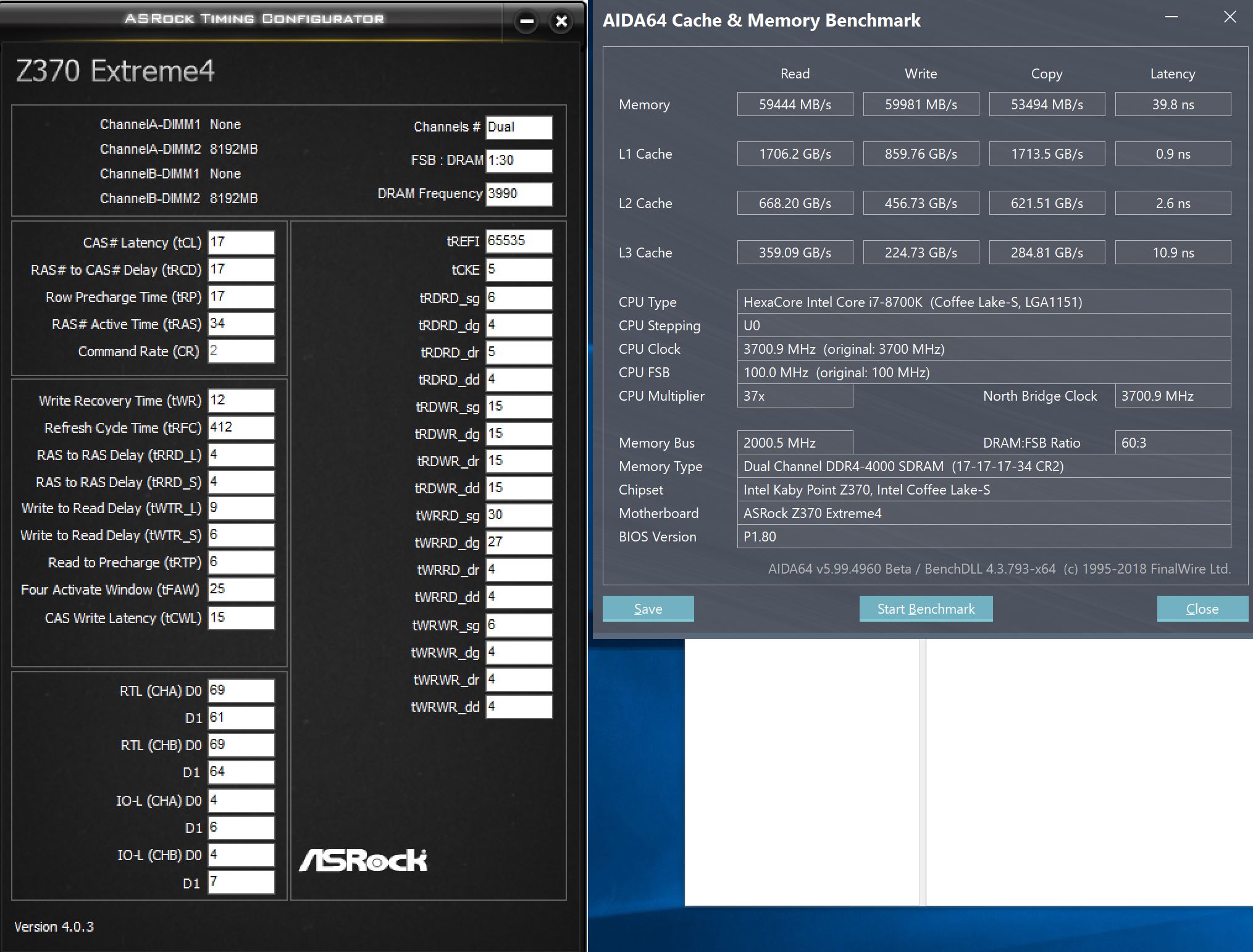 Помогите с настройкой таймингов, я запутался Z370 AsRock Extreme4 (bios 1.80 8700K DDR4 2x8GB Corsair Vengeance RGB 4266Mhz 19-26-26-46 B-die (напруга 1.42v) Дальше 4000 не смог нормально настроить, вижу по скорости в AIDA что где то косяк с таймингами, только вот с какими у меня плохо, я не пойму
