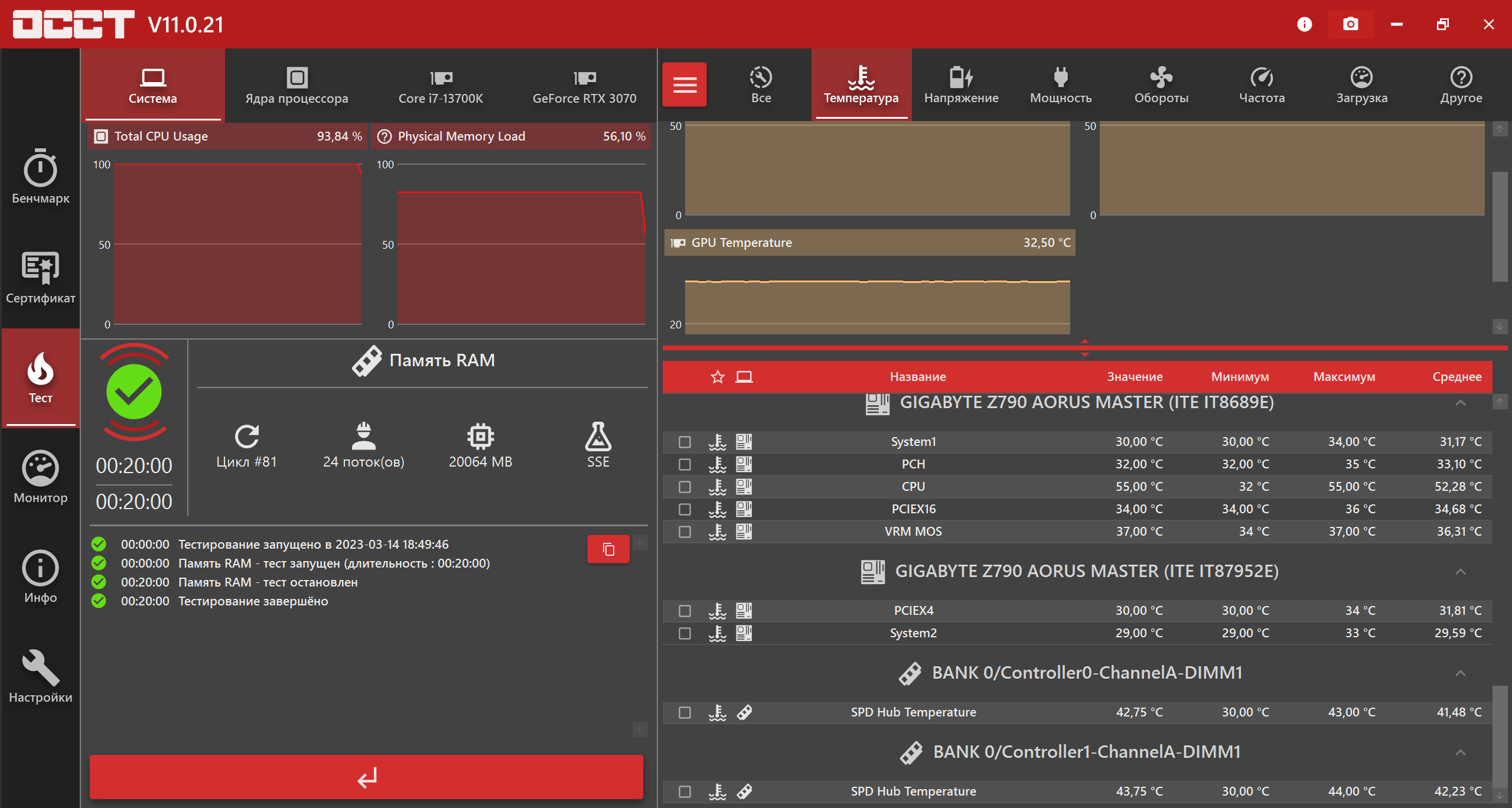 самая большая температура памяти была в ОССТ чуть меньше 43 градусов, сегодня потеплело и температура памяти на 1-1,5 градуса больше