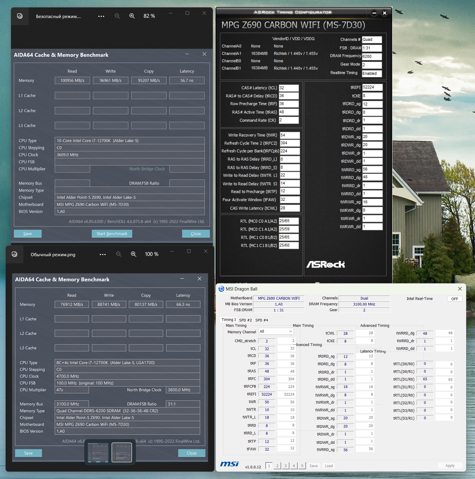 Почему, на верхнем скриншоте в безопаске у тебя все отлично. На нижнем под виндой +10нс и скорости как раз отжирает винда, хотя это довольно странно. Дело точно не в настроенной памяти. А энергосберегайки у тебя в биосе часом не включены? Должно быть как здесь: