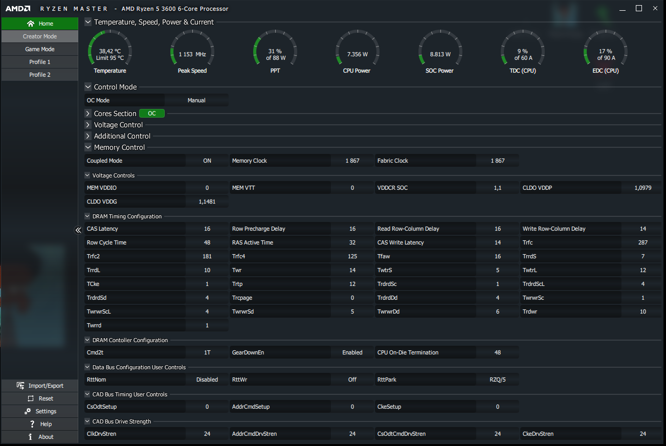 А смысл в таком интерфейсе на ZEN1? он же ничего дельного не показывает. XMeNN Ставьте на память 1.3v soc 1v Эти тайминги. Частоту 2400. Сопротивления Cad_bus все по 24. ProcODT 53. PowerDown off. GearDown On Если поедет, то поднимайте частоту пока работает, Когда упрётесь в потолок то скидывайте на 2 шага и пишите сюда. какая версия биос стоит?