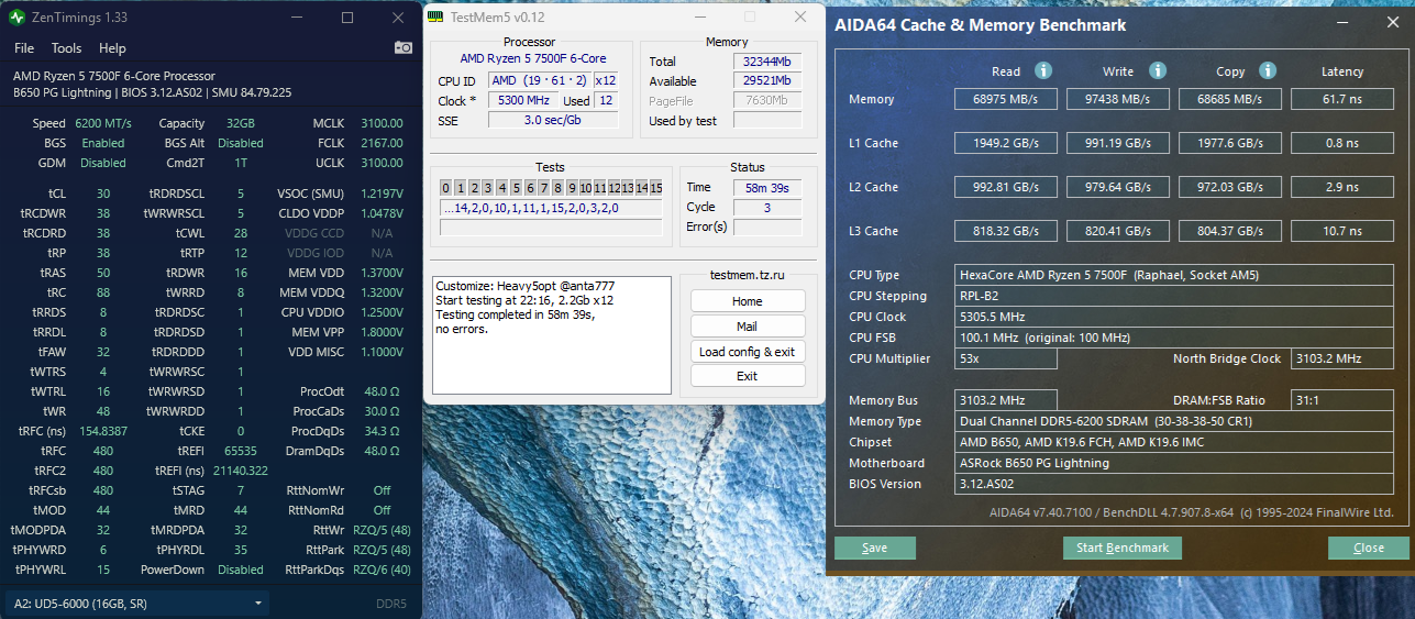Всем здравствуйте. Собрал компьютер на Asrock X679E и проц. Ryzen 7 7700. И поставил туда оперативную память XPG Lancer Blade [AX5U6000C3016G-DTLABBK] 32 ГБ. Выставил профиль XMP: 6000Мгц, 30-40-40 напряжение 1.35 и soc 1.25. Всё заводится и, вроде, работает. Но не проходит стресс тесты OCCT и Memtest5 universal. Заметил, что ошибки появляются, когда плашки греются до 52-54 градусов. Что можно сделать с этим? Может ли проц быть плохим и не держать заданные напряжения?
