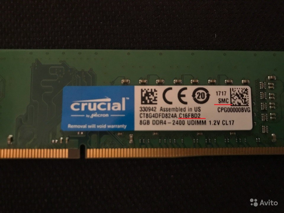Друзья, приветствую. Даны планки памяти CRUCIAL CT8G4DFD824A DDR4. На первом фото есть еще такая вот маркировка - C16FBD2. На другой планке, вроде бы аналогичной, с одинаковым парт-номером маркировка C16FBD1 Поиск по форуму и в Гугле ничего толкового не дал - что это и в чем разница. Так же на стикере есть еще две аббревиатуры - MT и SMC Что это значит? Фото планок прикладываю. Заранее благодарю за ответы!