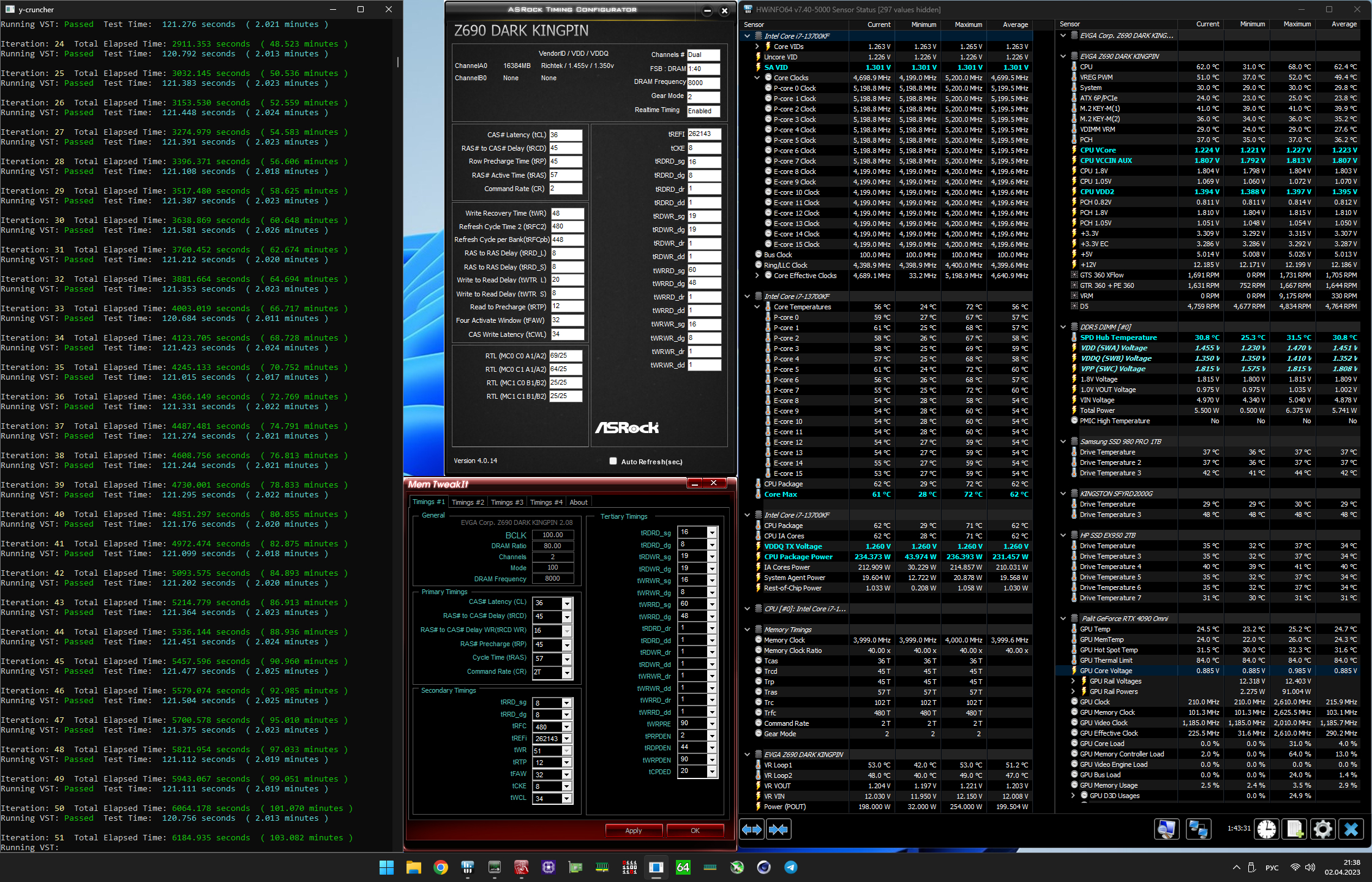 DRAM VDD/VDDQ 1.45V/1.35V (BIOS/HWiNFO/ASROCK). CPU VDDQ 1.26V, CPU VDD2 1.4V, SA Auto (1.3V), CPU AUX Auto (1.8V), CPU Vcore 1.225V, 5200/4200/4400 для тестов.