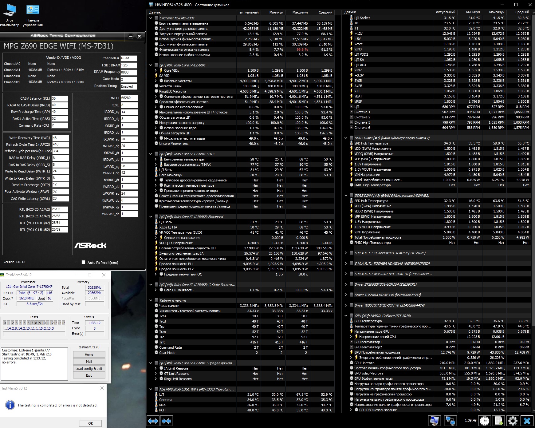Идеальные тайминги для 8000 CL36, фиксируем, ниже tRFC2 я бы не ставил, возможно будут вылеты именно в играх, типа 448 tRFC2 может быть стабильно в бенчах и тестах, а играх нет, а 464 ставить такое себе, 480 нормально (для запаса). Скоро подрублю вторую планку, чтобы сделать 8000 CL34 или выше по частоте что-то. Для 8000 CL36 требуется 1.45 и 1.47 на планках, 8000 CL34 1.5 (возможно ниже, не смотрел), не влияет сильно на CL видимо, может и 8000 CL32 1.6V достаточно будет даже.