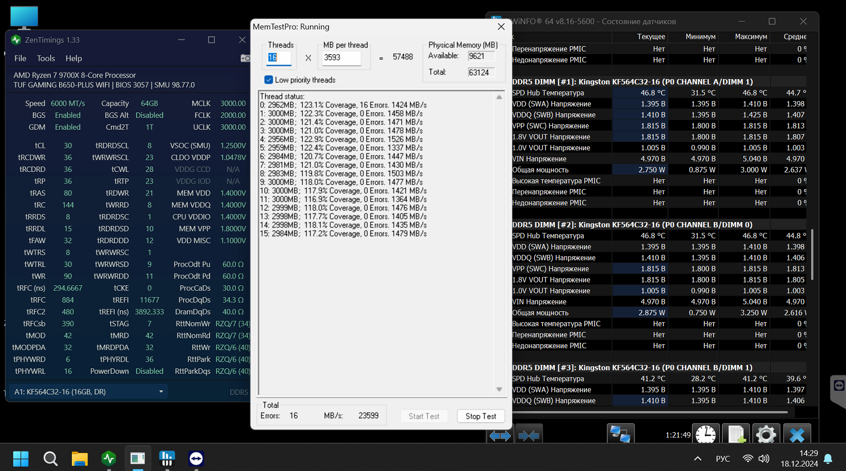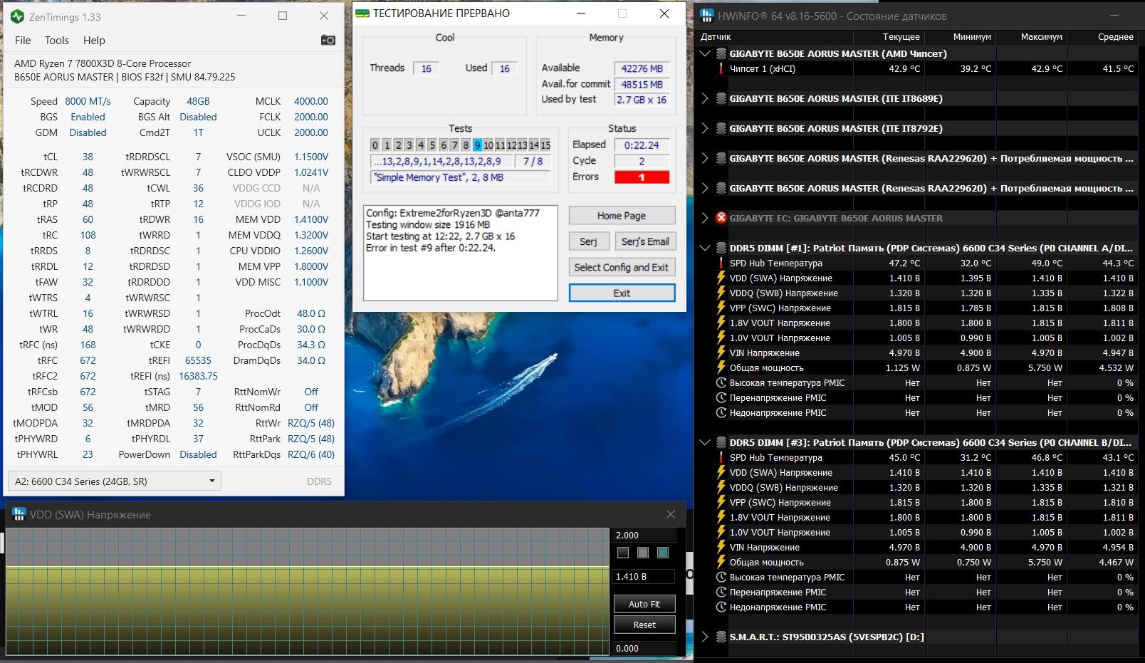 Цель запустить стабильно ОЗУ на частоте 6000 МГц в текущей конфигурации с оптимальными таймингами и минимальным напряжением. Обдува для ОЗУ нет. Первая настройка Установил XMP озу: 6000 МГц Установил напряжения: VDDSOC - 1.2 В (в XMP было - auto) CPU VDDIO 1.25 В (в XMP было - auto) DRAM VDD - 1.35 В (в XMP было - 1.4) DRAM VDD - 1.3 В (в XMP было - 1.4) Установил UCLK=MCLK Тайминги: tCL 30 (в XMP было - 30) tRCDWR 36 (в XMP было - 36) tRCDRD 36 (в XMP было - 36) tRAS 48 (в XMP было - 80) tWR 48 tRTP 12 Тест: - MemTestPro - ERROR ИЗМЕНЕНИЯ: корректирую tRAS с 48 на 80 Тест: - MemTestPro - 1 час без ошибок (тестирую стабильность работы памяти-таймингов) - y-crancher - 10 итераций без ошибок (тестирую достаточность напряжений) ИЗМЕНЕНИЯ: Trc 116 Trfc1 400 TrrdL 8 TrrDs 8 Tfaw 32 Тест: - MemTestPro - 1 час без ошибок (тестирую стабильность работы памяти-таймингов) ИЗМЕНЕНИЯ: TwtrL 16 TwtrS 4 TrdrdScl 8 TrdrdSc 1 TwrwrScl 8 Тест: - MemTestPro длительный тест: 4-5 часа (приблизительно) без ошибок, но спустя 8 часов 20 минут теста вижу 64 ошибки. В HWinfo температура SPD Hub максимум 57 градусов. ИЗМЕНЕНИЯ: возвращаю все вторичные тайминги в "авто" оставив только первичные: 30-36-36-80 при напряжениях указанных в начале поста на частоте 6000 МГц и снова начинаю длительный тест MemTestPro в надежде что ошибки дают вторичные тайминги и в самом начале я поторопился. Ниже прикрепляю два фото ZenTimings: 1) то что тестировалось 8 часов и дало 64 ошибки со вторичными 2) текущее тестирование с авто-вторичками. Прошу дать совет по настройке и куда двигаться дальше?