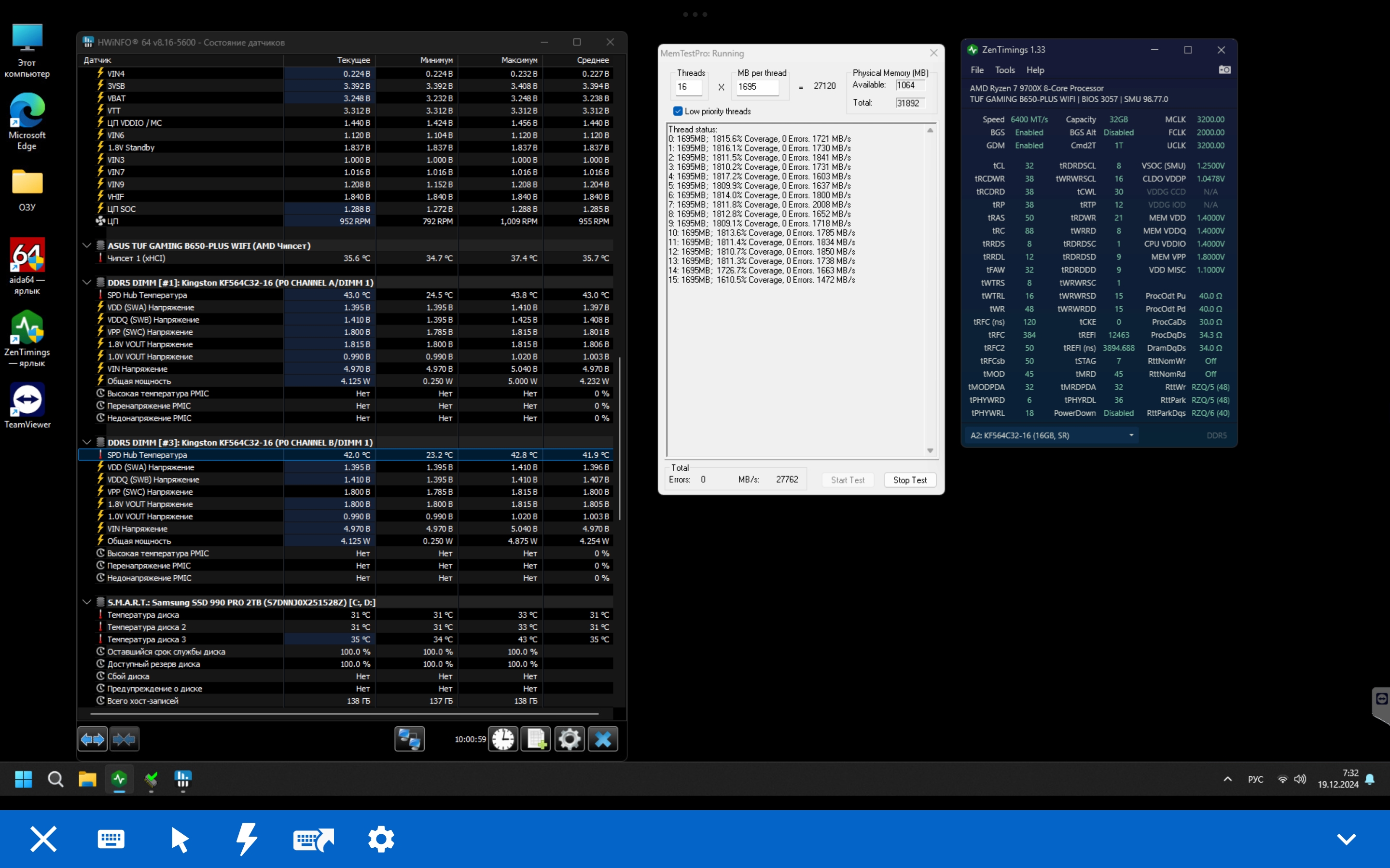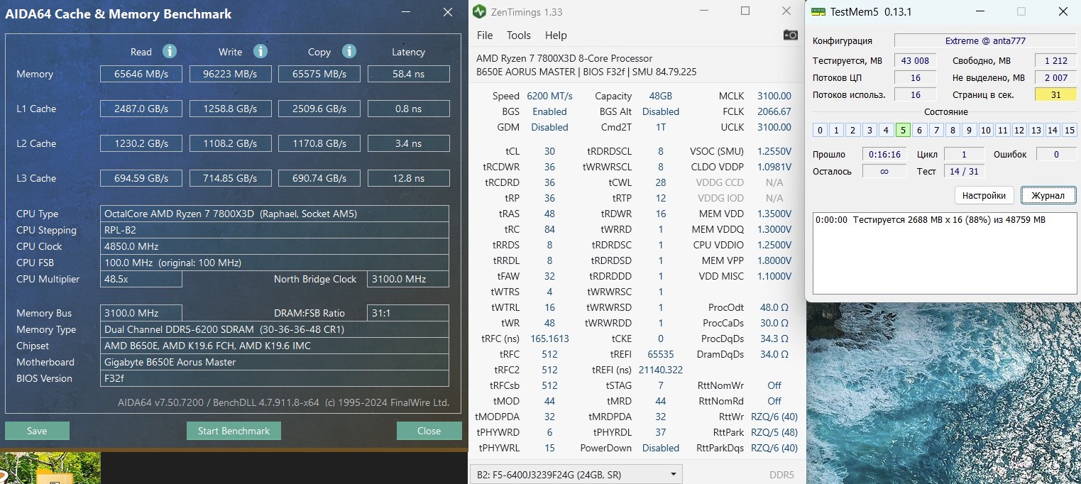 При 6000 на всех "авто" кроме первичек 30-36-36-80 1.4В получаю при длительном тесте ошибки в MemTestPro. Я вижу решение - либо уменьшать частоту ниже 6000, либо пробовать задирать первички. И такое решение мне не понравилось. Убрал 2 плашки оставив просто во 2-4 слот один набор 16х2. Тестировал MemTestPro 10 часов на частоте 6400Мгц 32-38-38-50 успешно (при 4х плашках о такой стабильности даже на 6000 речи не шло).