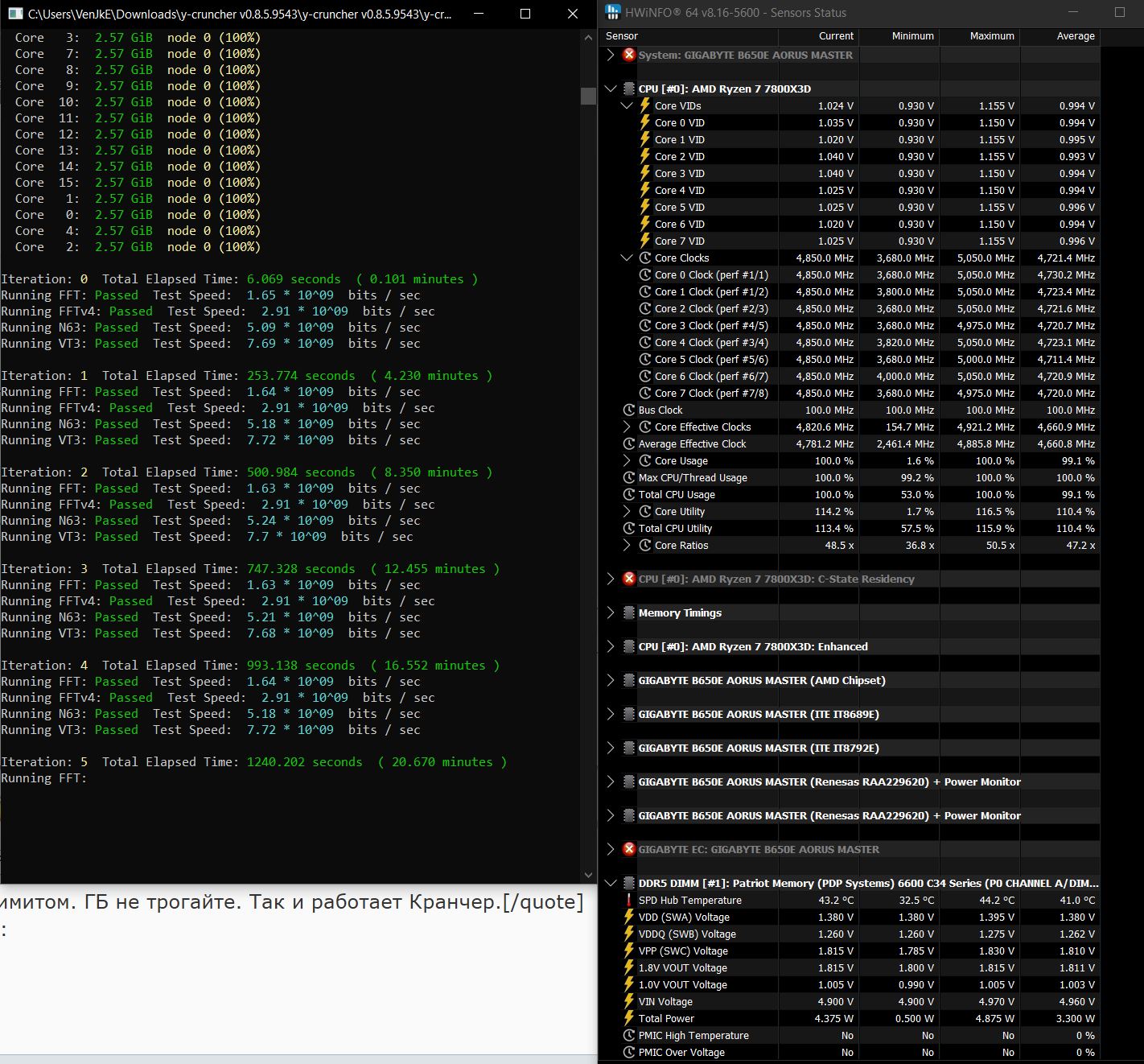 Я бы PBO вообще выключил, если лимит t нужен, то его отдельно выставил бы. И проходил бы полноценный VT3 1-2часа и TM5 ex3d@anta777 друг за другом поочереди, и если все ок с ними тогда еще что то можно...(Но нужно ли?) Затем только когда мой профиль памяти поработает хотябы 2-3 дня с ежедневными проходами по 2-3 цикла таких тестов(Каждый день на холодную обязательно!), естественно без каких либо сбоев или глюков в повседневном использовании. Вот тогда уже можно Включать курву и тестировать ее будучи уверенным в том что если что то не так то это именно она, а не память. Да что говорить если у меня 7800x3d с начала этого года, а в первый раз я пошевелил PBO и курву - вчера! Все время до, я занимался только настройкой и тестированием памяти Так что на меня ориентироваться не стоит, а мораль басни такова - Приступая к чему то новому, убедись что закончил старое. Либо Курву до конца тестируй со сток памятью, либо память тестируй без курвы. Вместе только когда уверен в чем то одном.