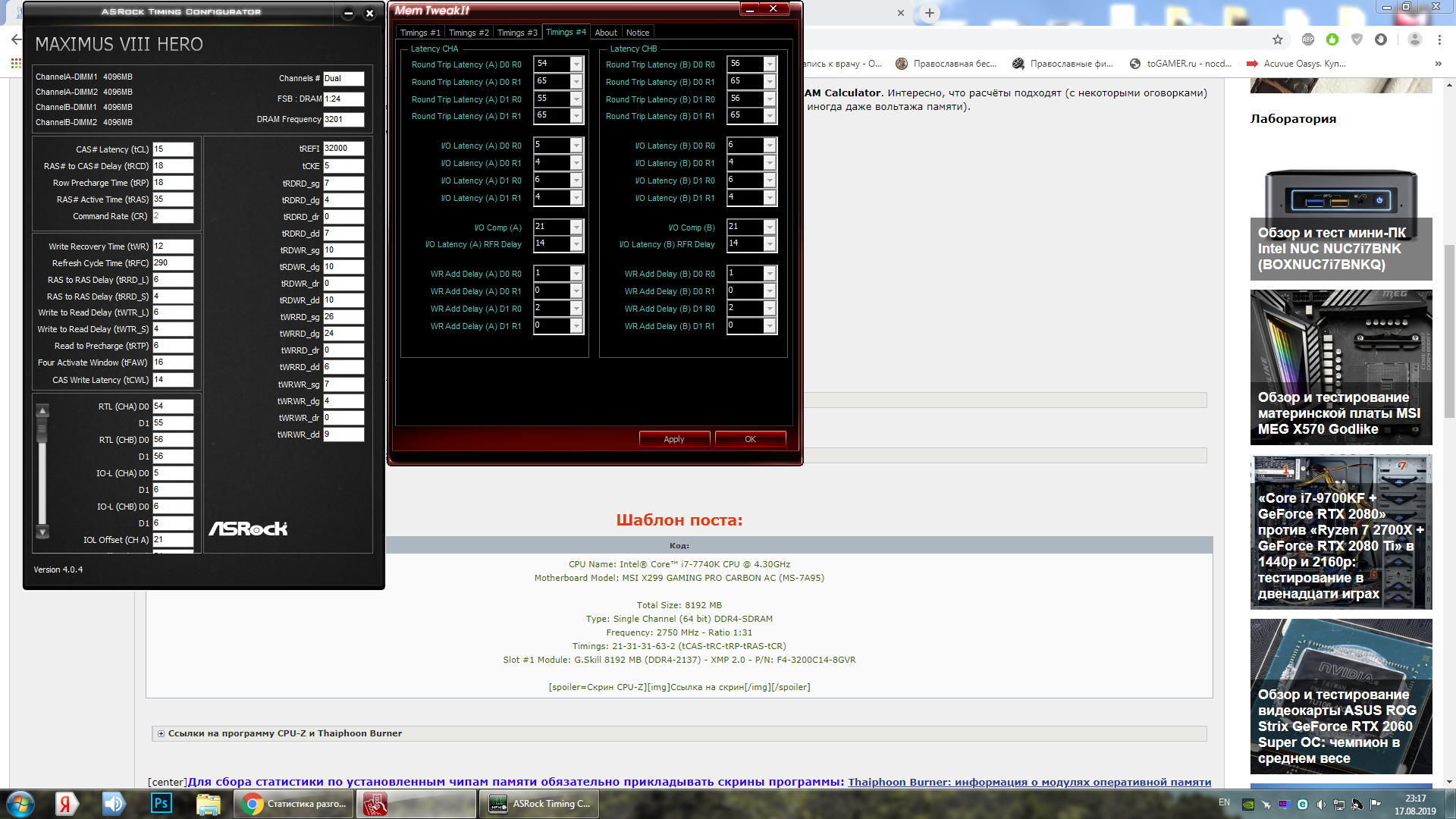 В общем провел небольшое расследование по поводу кукурузности разгона памяти ибо выпал в дисонанс когда на 4400CL17LT получил в Linx жалких 400ГФлопс, а на 4000CL16LT около 500ГФлопс. Провел пару тестов акромя линкса и выяснил что производительность либо поднялась либо осталось прежней от разгона памяти (теста я провел всего 3: 7z, FireStrike, Haven) получается что Linx прям ппц как сильно зависит от таймингов вторичных которые опустить уже не получится и тут возникает вполне закономерный вывод: нахер Linx. Поправьте меня если я не прав. Вот мои настройки и тестики: https://drive.google.com/drive/folders/ ... sp=sharing