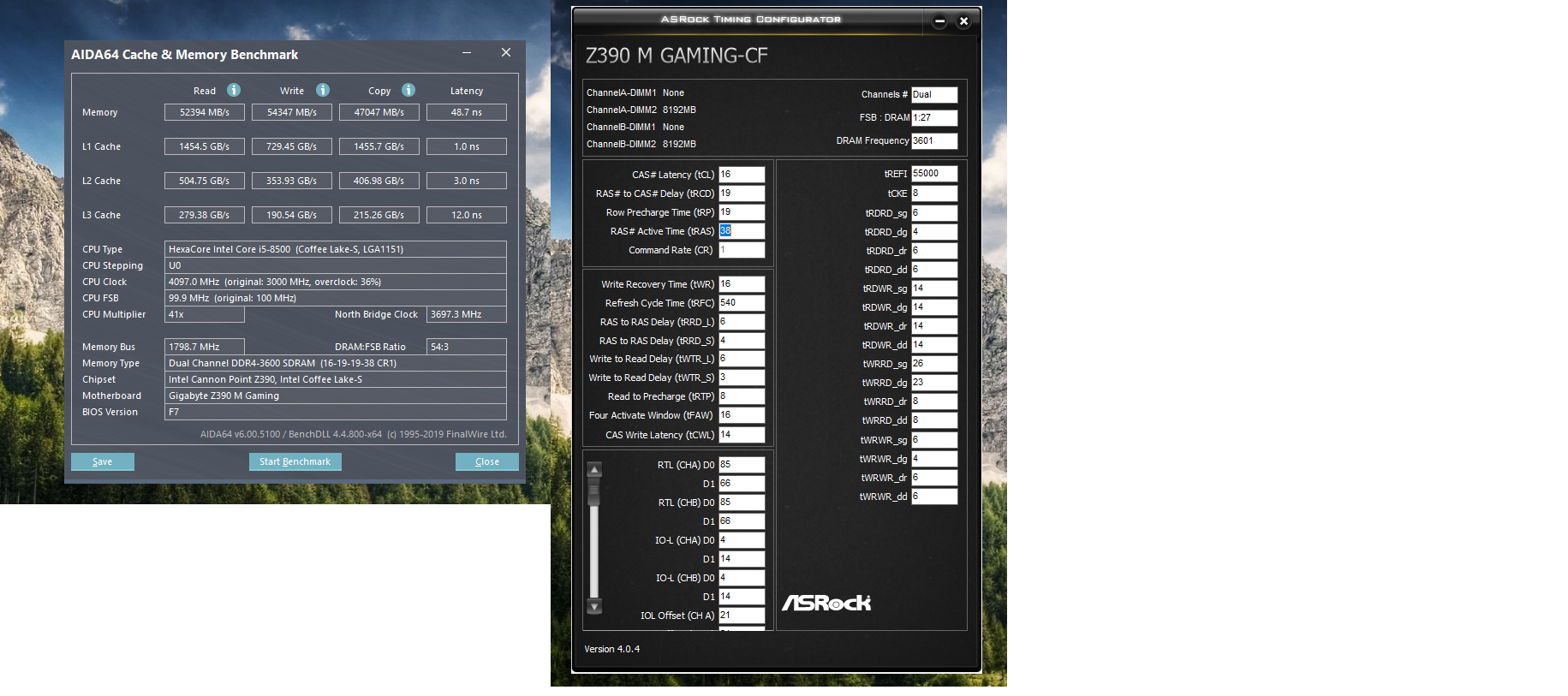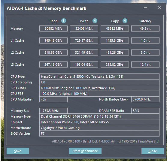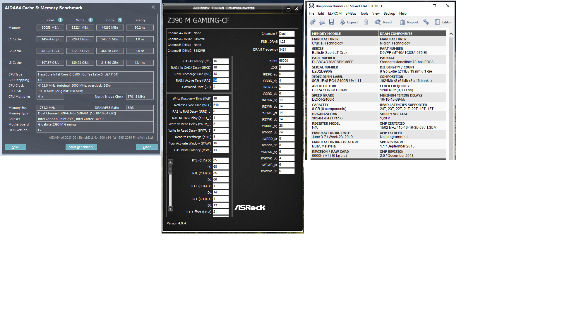 Доброго времени суток. Потратил вечерок на тесты CRUCIAL Ballistix Sport LT BLS2K8G4D30AESBK на относительно бюджетной сборке: i5-8500/Gigabyte Z390 M GAMING Лучший стабильный результат по производительности - 3466Мгц, основные 16-18-18(17)-34, напруга 1,35v, вторички на скринах. Если есть у кого еще результаты по этим плашкам, кидайте, интересно сверить. Вероятнее всего с более серьезной платой и процом результат будет интересней И люди добрые может кто пояснить почему RFC ниже 520 ни в какую не идёт? Хотя рефи от 55000 до 65000 абсолютно любое значение подхватывает.