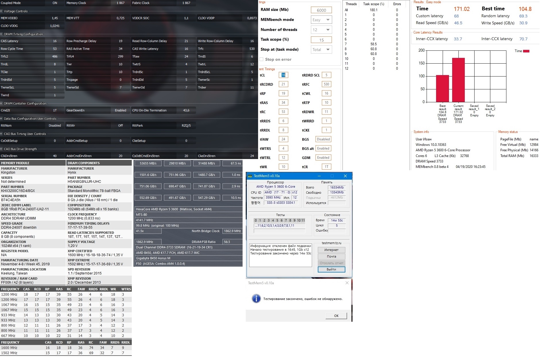 Пробую чуть подвинутся вверх по частоте, без особого повышения напряжения, но почти не идут. на таймингах из калькулятора для 3600 мгц без ошибок только на 3466 на 1.33в на таймингах от 3733 мгц уже ошибки на 3533 при 1.33в