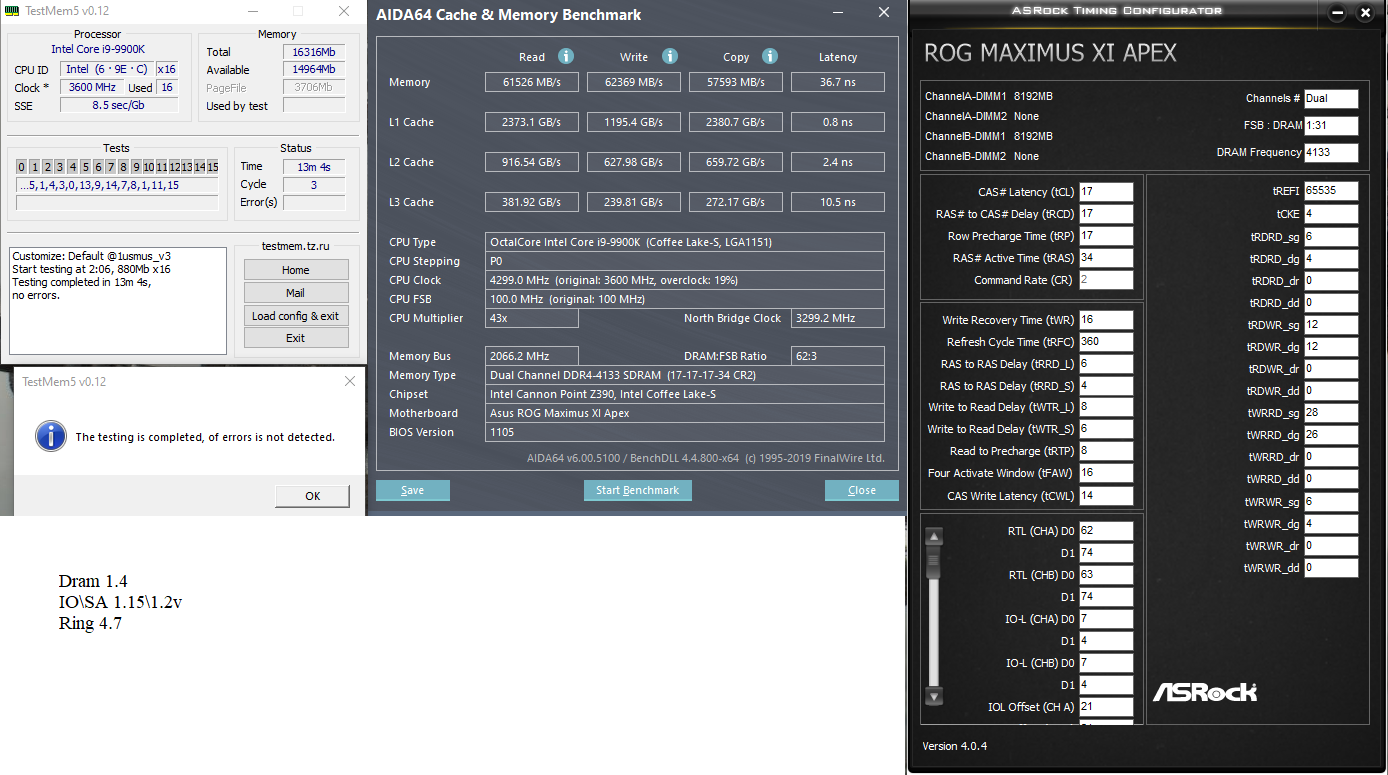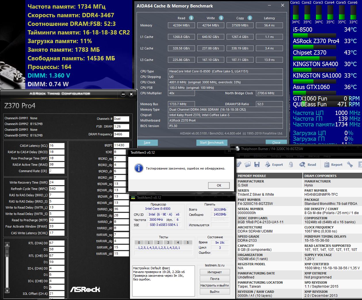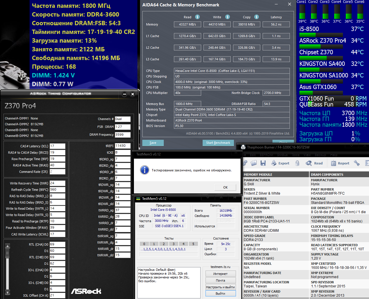 Может ты подскажеш, приобрел по случаю G.Skill Trident Z 16GB (2x8GB) Память попалась Part Number F4-3200C16-8GTZSW на чипы Hynix M-die Стоковые 15-15-15-36-50 /2133, XMP 2.0 16-18-18-38-56 / 3200 Конфиг: CPU Name: Intel® Core™ i5-8500 Processor (9M Cache, up to 4.10 GHz) Motherboard Model: ASRock Z370 Pro4 (DMI версия BIOS P3.30) Ручками сделал стабильные 3466 на 16-18-18-38 1,35v и 3600 на 17-19-19-40 1.4v, брал и выше 3600 с большими таймингами, винда грузилась но MemTestы с ошибками, к сожалению на мамке особо долго разгоном не поиграешься потому как при неудаче на дефолтные тайминги и частоты не очень хочет заходить в биос, приходиться перезагружать несколько раз или сбрасывать батарейкой что жрет очень много времени Стоит ли играться дальше(вдруг кто добился большего на аналогичном конфиге) или остановится и не парится, и на каком варианте остановится 3466 на 16-18-18-38 1,35v или 3600 на 17-19-19-40 1.4v и что подправить на остальных параметрах(ASRock Timing Configurator), заранее спасибо за разумные советы ...
