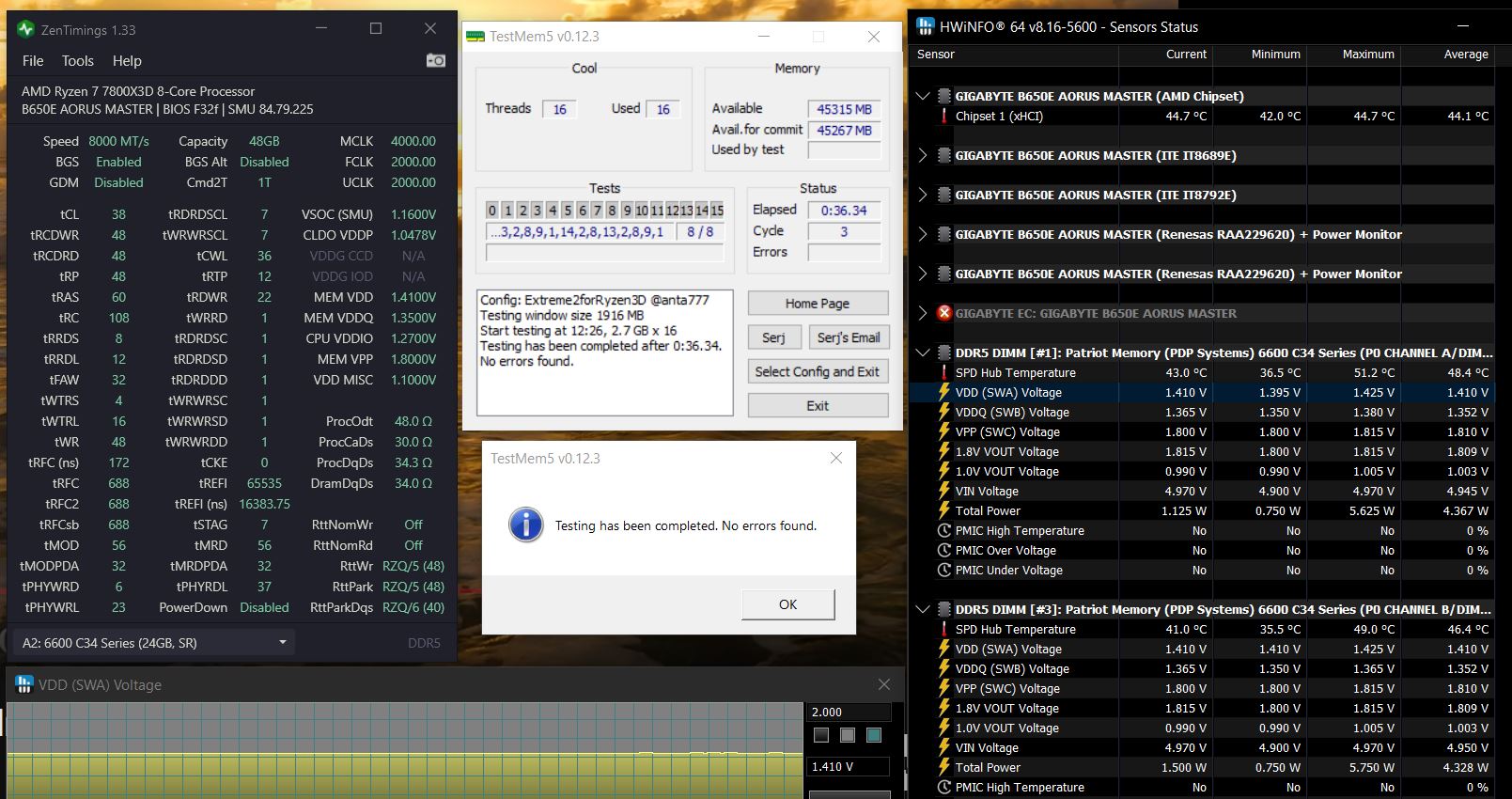 По спецификациям JEDEC все три напруги вообще должны быть одинаковые, я писал в тех.поддержку MSI по поводу VDDIO на моей сборке и мне ответили что до 1.4В(включительно) вообще полностью безопасное напряжение, максимально допустимое 1.45В, здесь же все проповедуют что VDDIO=1.3+ это всё кранты - контролер загнётся, процессор деградирует и т.п., выдумывают какие то правила (как будто у всех абсолютно одинаковая память и контроллеры в цп), прямо секта какая то, у меня 7800X3D отработал почти год на Soc=1.28V и VDD/VDDQ/VDDIO=1.4v/1/4v/1/4v и ни хрена с ним не стало, был удачно продан перед Новым годом и отлично работает у следующего владельца.
