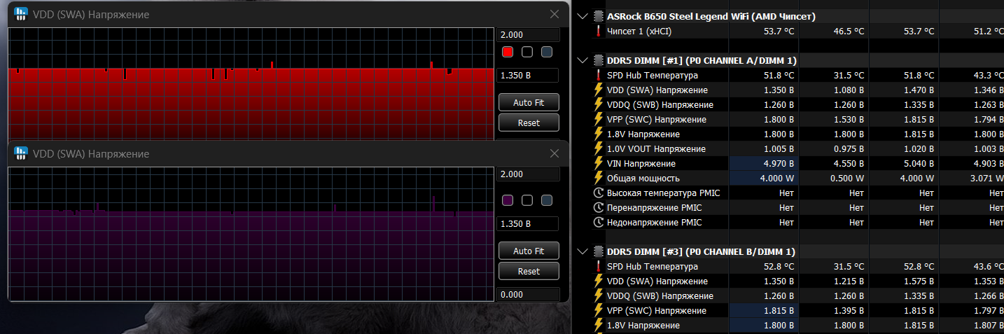 Хм никогда не обращал внимание, но на канале A напряжения VDD, VPP и 1.8В прыгают. Для VDD в bios стоит 1.435 и оно прыгает в диапазоне 1.005-1.440, VPP в диапазоне 1.410-1.815 хотя стоит 1.8, 1.8В тоже иногда опускается до 1.425. На канале B нет такого максимум -0.015 - +0.015. В чем прикол вообще, это какая то энергосберегающая технология как в ноутбуках или что, почему только на канале A.