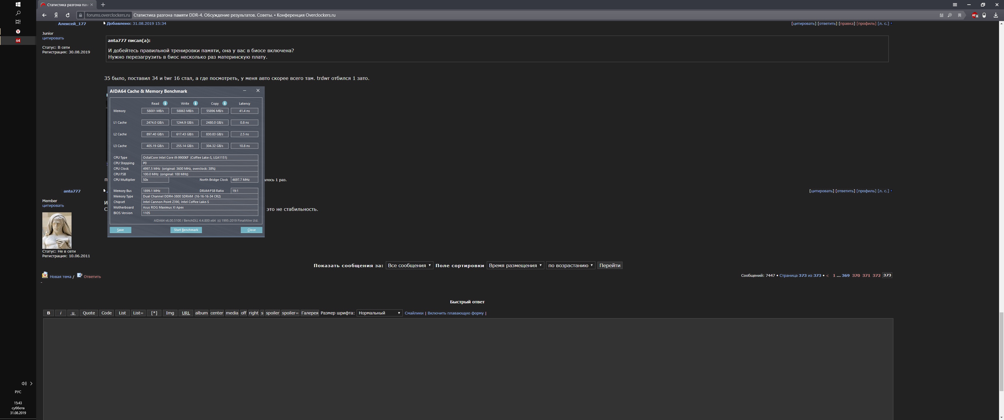 На гиге были те же чтение-запись, копирование, только латенси 40. Тут 41+ и нет стабильности даже в дефолтном тесте, я просто слышал, что апекс лучше гонит память, чем две планки на гиге, интересно в гигу 4 воткнуть... Может продать апекс и докупить ещё 2 планки к ультре? +там вчера новый биос вышел в котором затронута память. Я почему с 3800cl16 начал - потому, что там всё чётенько было, а тут печалька-печальная и х2 раза дороже.
