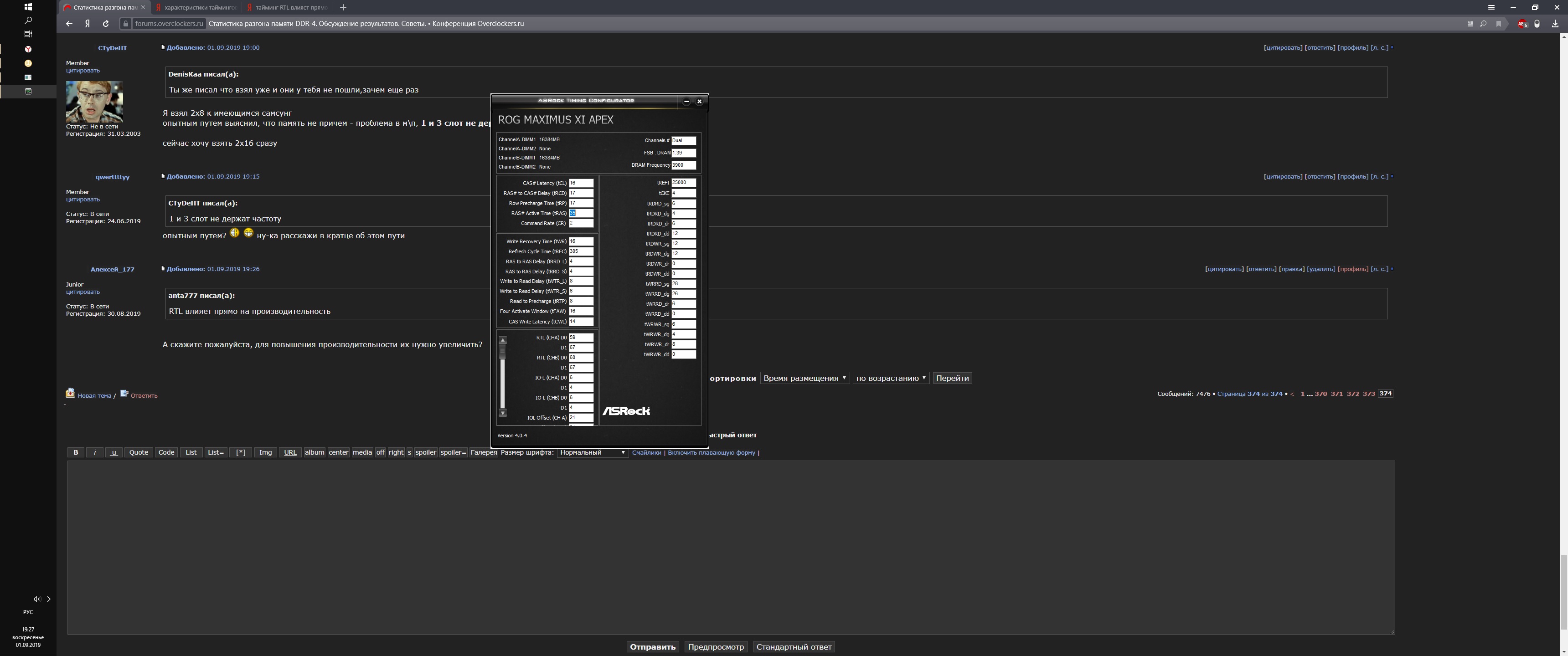 Универсальный гайд. 0. Устраните любые потенциальные проблемы с другим железом. Снимите разгон с видеокарты, снизьте частоту цп на 300 с сохранением напряжения. Не забудьте вернуть RTL в авто если сейчас не авто. 1. Крутим очень короткий мемтест, то есть если минуту живёт сразу снижать тайминг дальше. Ищите не стабильность, а явно сбойное значение тайминга, запишите его - пригодится. Гораздо проще найти явно нерабочее значение и от него плясать чем пытаться ловить нестабильность часами. Это также помогает диагностировать сбойные тайминги на ранее "стабильной памяти". Не пытайтесь найти предельные значение сразу. Сначала скрутите до +2 от минимально стабильного. Многие тайминги идут параллельно поэтому бессмысленно пытаться скрутить до упора с первого прохода. CR выставить на 2 если стоит 1. В самом конце можно попробовать скинуть до 1. 3 Ставить только на очень большую частоту или если по другому ну совсем никак.
