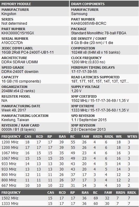 Module Manufacturer: Kingston Module Part Number: KHX3000C15/16GX DRAM Manufacturer: Hynix DRAM Components: H5AN8G8NMFR-TFC DRAM Die Revision / Lithography Resolution: M / 25 nm Module Manufacturing Date: Week 51, 2017 Module Manufacturing Location: Keelung, Taiwan Module Serial Number: A62A302Eh Manufacturing Identification Label: 0000007919189 Module PCB Revision: 00h